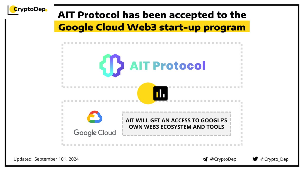 AIT Protocol joins the Google Cloud Web3 start-up program. Through this innovation, AIT will get an access to Googleβs own web3 ecosystem and exclusive tools. Moreover, this move might lead to AIT's listing on Google Cloud marketplace. AIT Protocol, incubated by PAAL AI & Metabros, is a Web3 data platform specializing in data annotations and AI model training, backed by Animoca Brands, Morningstar Ventures, Maven Capital, Momentum 6, and others.