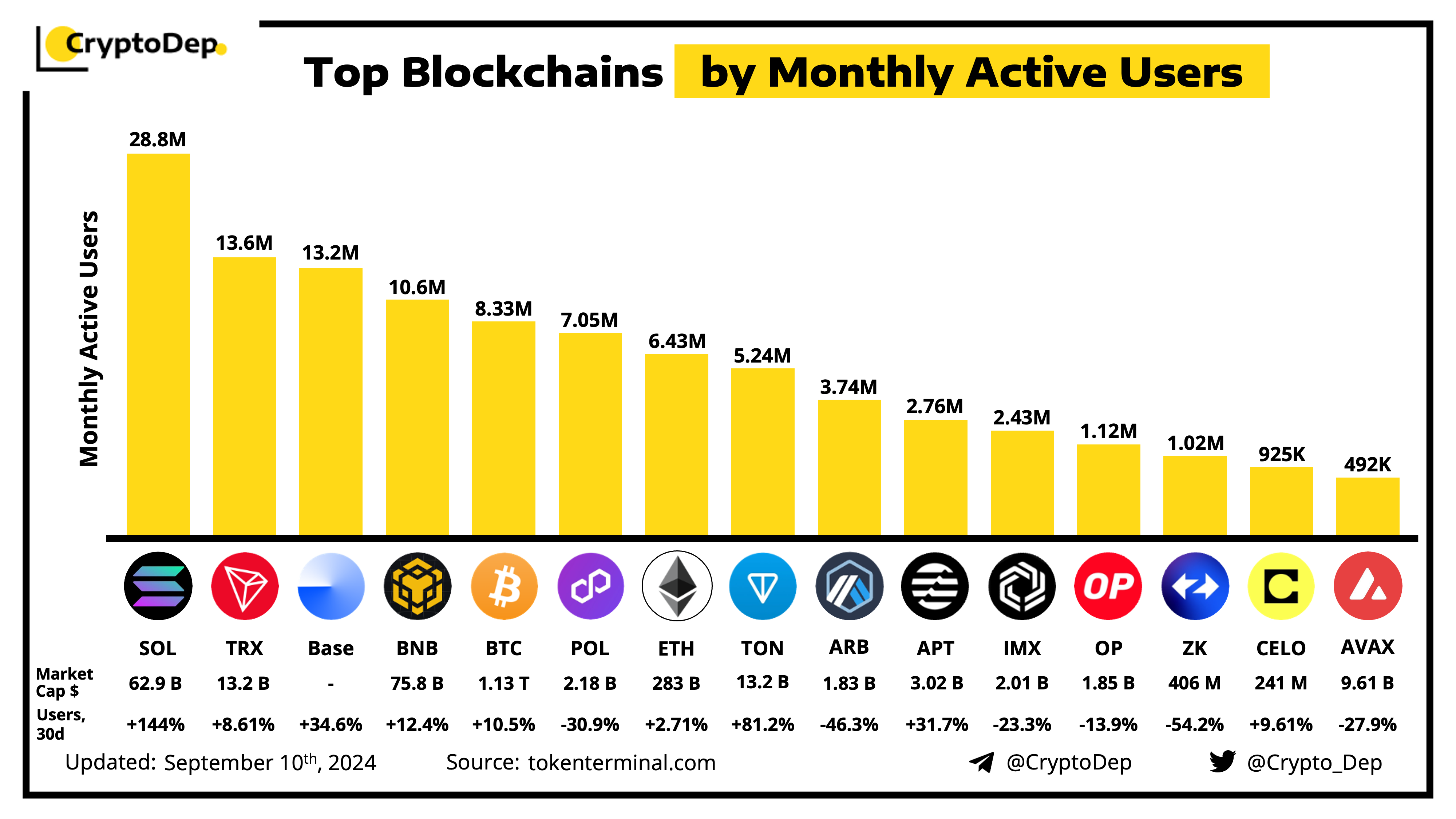 Monthly active users measure the number of distinct addresses interacting with blockchains' relevant contracts. According to the data from TokenTerminal, Solana, Tron, Base, BNB Chain, and Bitcoin have drawn the largest numbers of users lately.