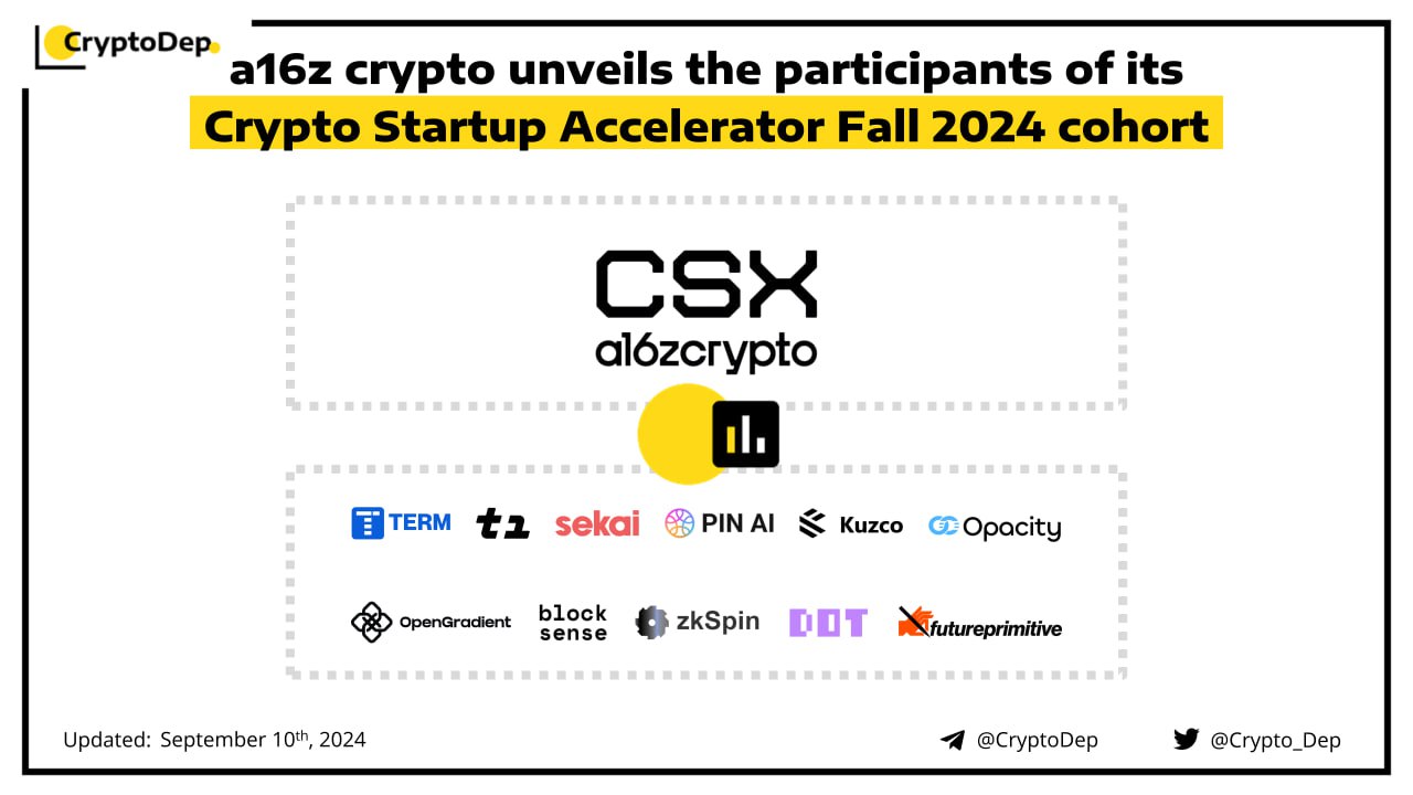 a16z crypto has selected 21 startups to join the Crypto Startup Accelerator (CSX) Fall 2024 cohort, which starts this week. Among participants are Term Labs, t1 protocol, Sekai, PIN AI, OpenGradient, Opacity Labs, Kuzco, Dot, zkSpin, Blocksense, and many more. Through the program, the startups will get lessons from top crypto founders, receive guidance and support from a16z cryptoβs investing and operating teams, and build connections with each other and the broader a16z network. Moreover, a16z CSX invests a minimum of $500,000 in each company thatβs accepted.