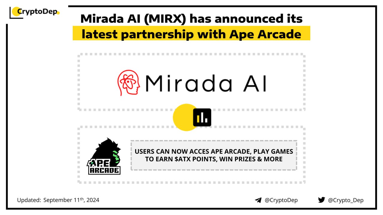 Mirada AI partners with Ape Arcade, a recently launched multi-platform gaming arcade on Telegram, by Ape Terminal. Mirada AI will hold its $MIRX IDO on numerous platforms on September 13th. Mirada AI is a decentralized AI tool, powered by AI via $MIRX, that offers image generation, face-swap, animation, LLM chat, image upscaling, and more.