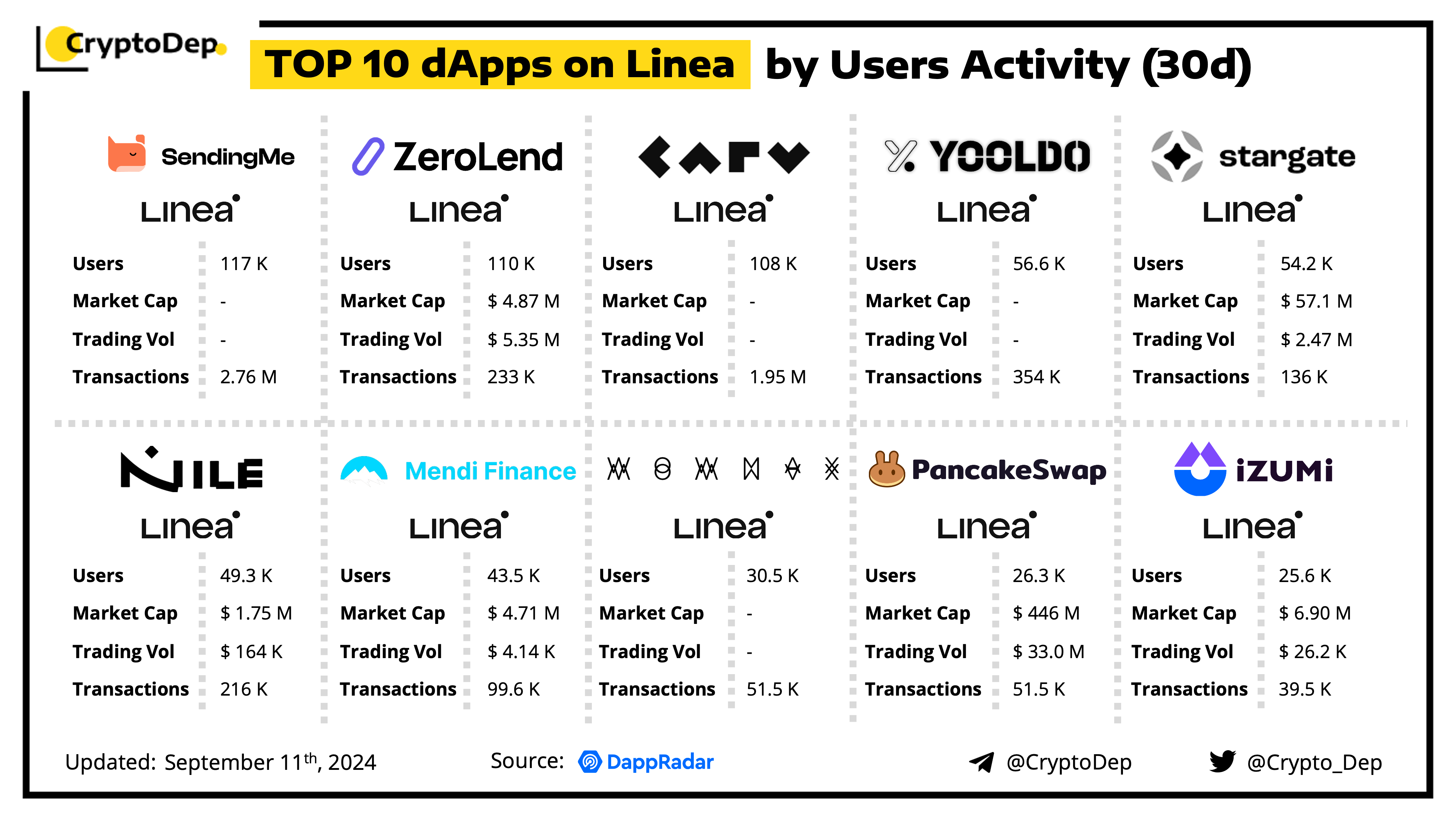 A decentralized application (dApp) is a program built on blockchain that combines a smart contract and a front-end user interface. We present the top dApps on #Linea by users activity in the last 30 days, according to the data from DappRadar.