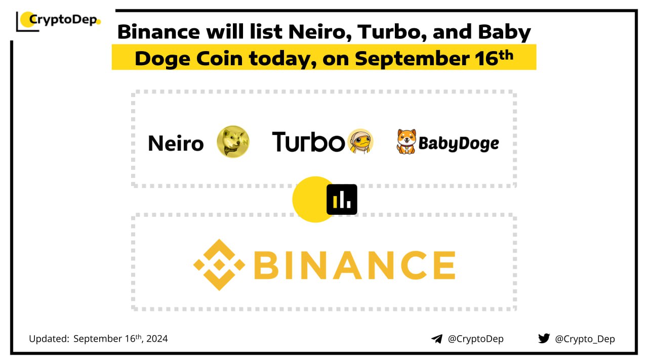 ββBinance will list Neiro, Turbo, and Baby Doge Coin today, on September 16th