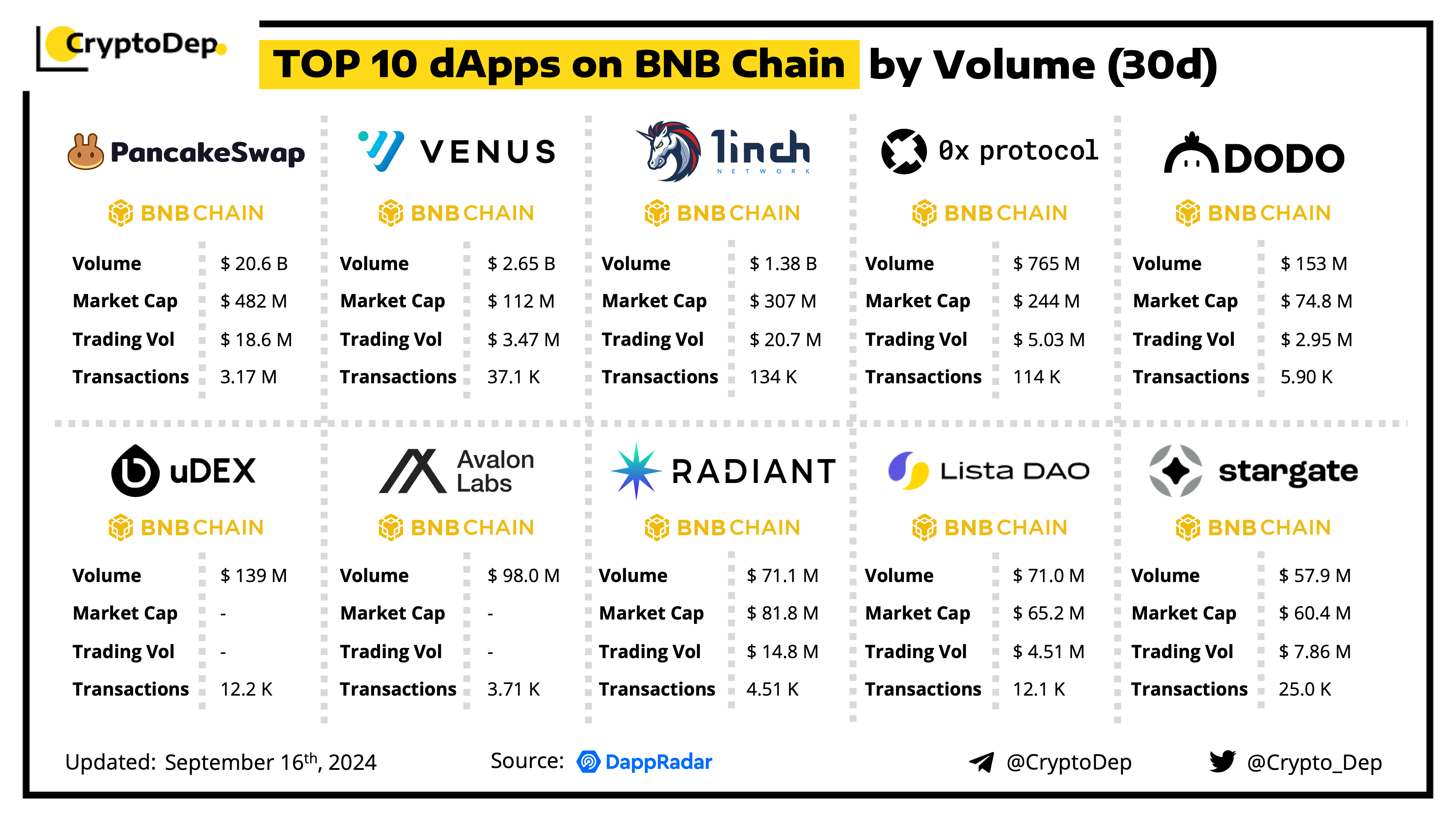 A decentralized application (dApp) is a program built on blockchain that combines a smart contract and a front-end user interface. We present the top dApps on #BNBChain by volume in the last 30 days, according to the data from DappRadar.