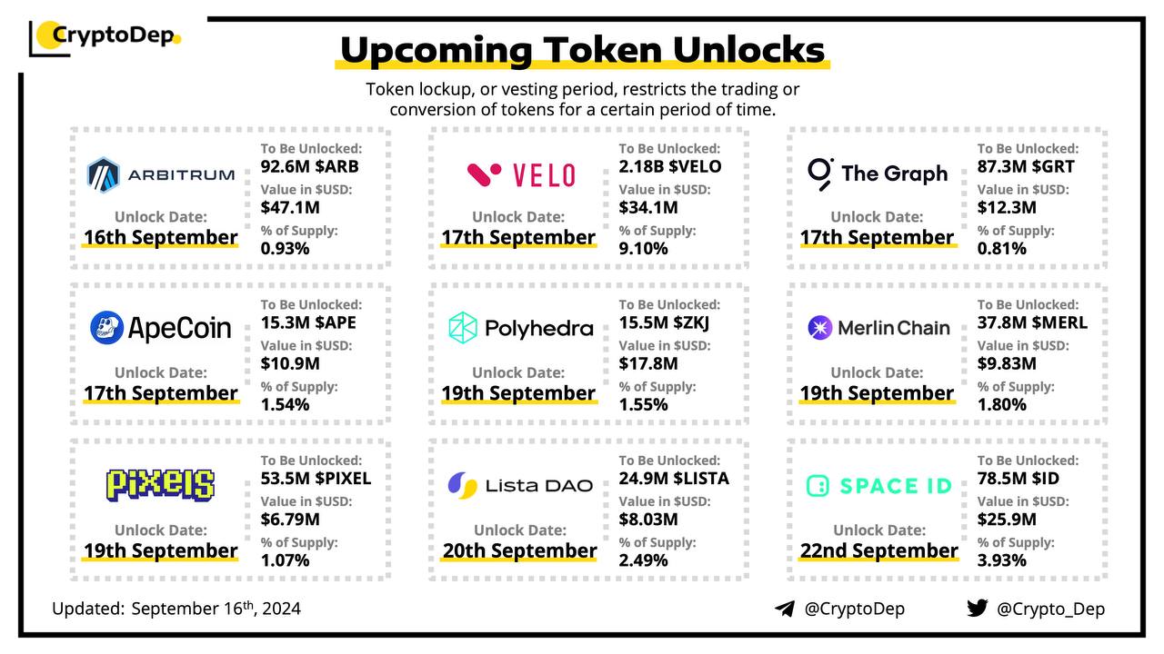 Let's take a look at the compilation of major upcoming token unlocks, diving into details such as dates, amounts, and projects related to tokens that are currently locked up, but will soon be released to the market. During this week, $ARB, $VELO, $ID, $ZKJ, and $GRT will have the biggest unlocks.