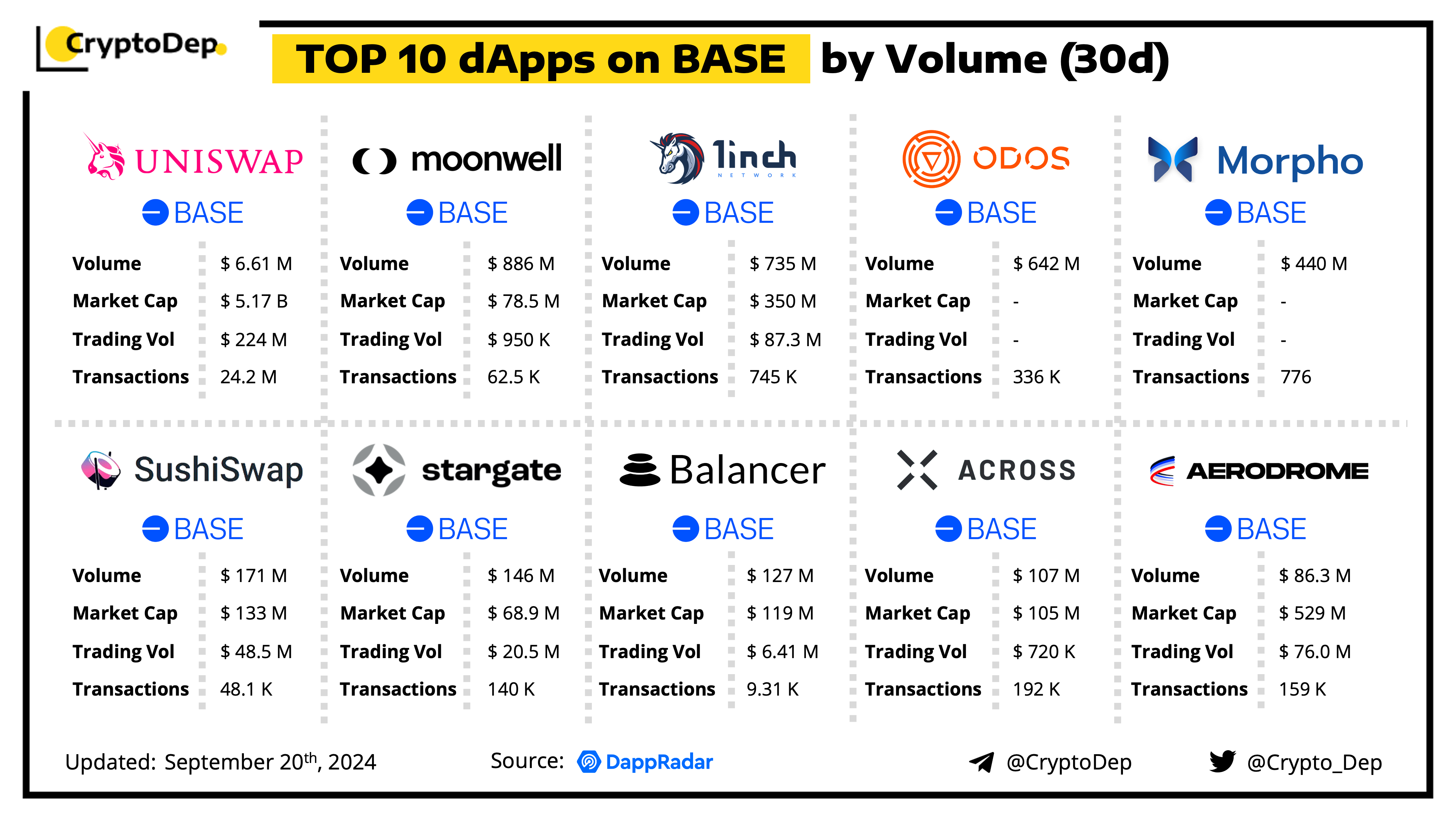 A decentralized application (dApp) is a program built on blockchain that combines a smart contract and a front-end user interface. We present the top dApps on #Base by volume in the last 30 days, according to the data from DappRadar.