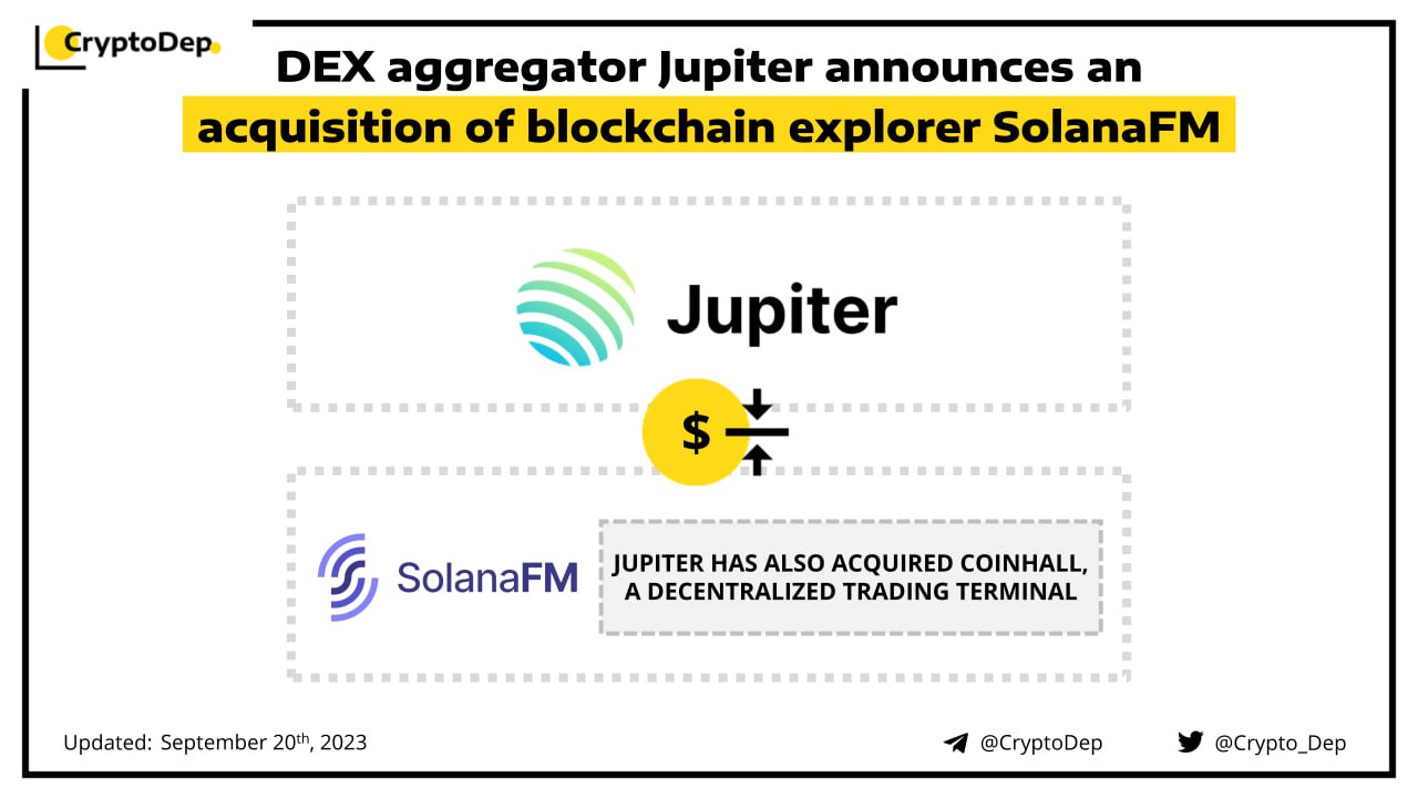 Jupiter co-founder has announced that the decentralized exchange aggregator has acquired blockchain explorer SolanaFM. SolanaFM, which raised $4.5M from SBI Group in 2022, allows users to access and interact with Solana data through its indexer and explorer tools. This move follows Jupiter's previous acquisition of Coinhall, the number one aggregator across Cosmos. Moreover, Jupiter rolls out its own API platform, Metropolis, to provide more comprehensive liquidity APIs for developers across token.