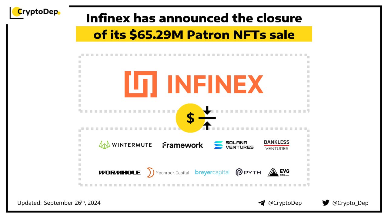 Infinex raises $65.29M through its Patron NFT sale backed by Wintermute, Framework Ventures, Moonrock Capital, Bodhi Ventures, Wormhole, Breyer Capital, Solana Ventures, Near Foundation, Bankless Ventures, Synthetic Ventures, Pyth and others. Infinex is a decentralized perpetuals exchange that supports six EVM and non-EVM chains, including Solana, Base and Arbitrum.