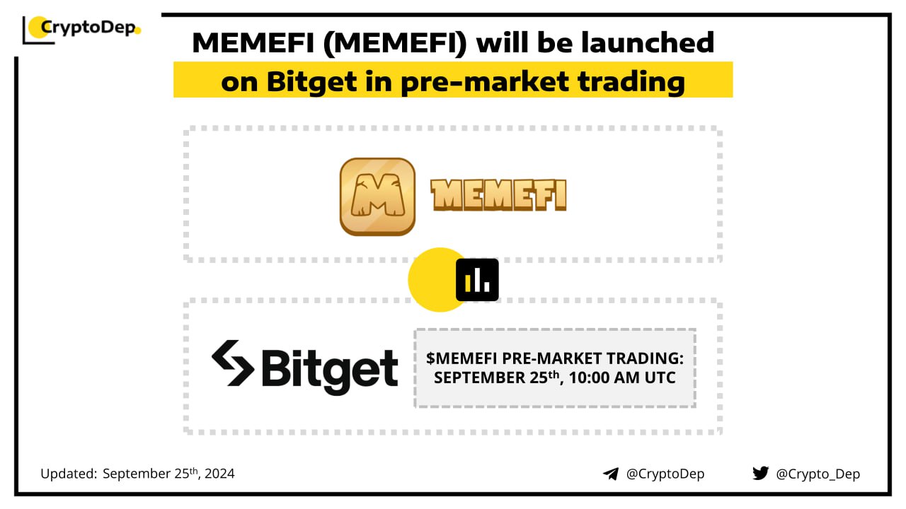Pre-market trading for $MEMEFI will start on Bitget today, on September 25th, at 10:00 AM UTC! Users will be able to trade $MEMEFI in advance before it becomes available for spot trading. MemeFi is a gamified Telegram ecosystem that monetizes user engagement via incentives, innovating in the sphere by introducing new engagement solutions into Telegram.