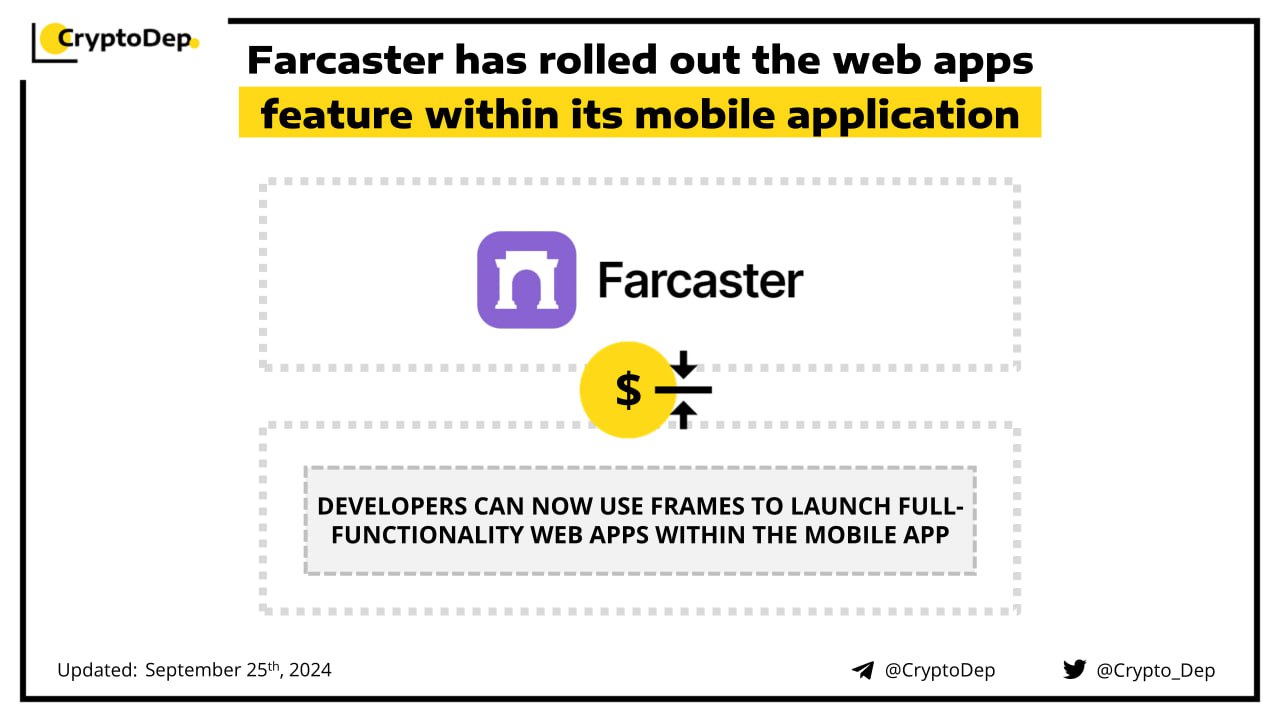 Farcaster introduces the mini apps feature to its mobile app users and developers. This innovation allows developers to use frames to launch full-functionality web apps within the mobile app.