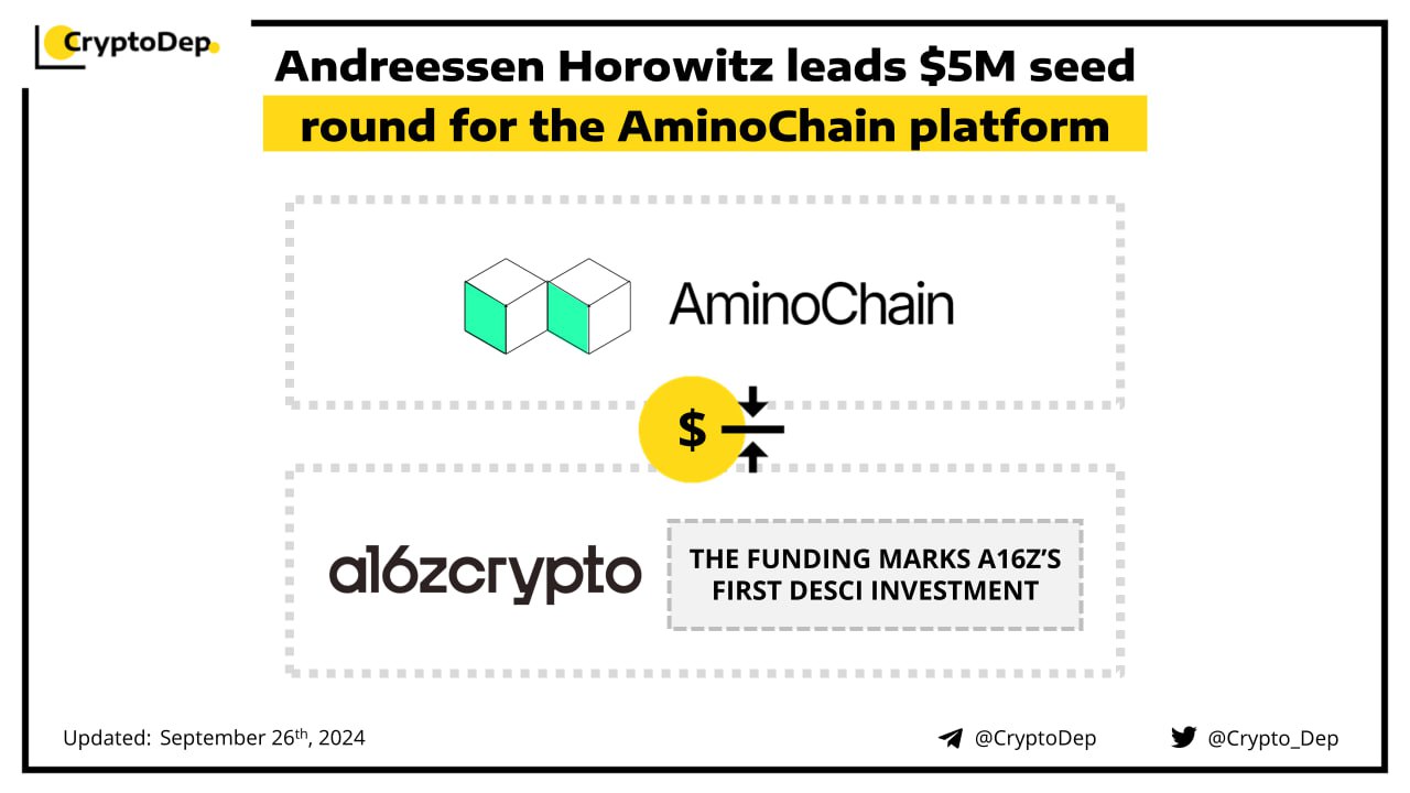 AminoChain announces the closure of its $5M seed funding round led by Andreessen Horowitz. The round brings AminoChain's total funding to $7M and marks a16z's first DeSci investment. AminoChain develops a decentralized biobank and Layer 2 network, which will connect enterprise medical institutions looking to share medical data.