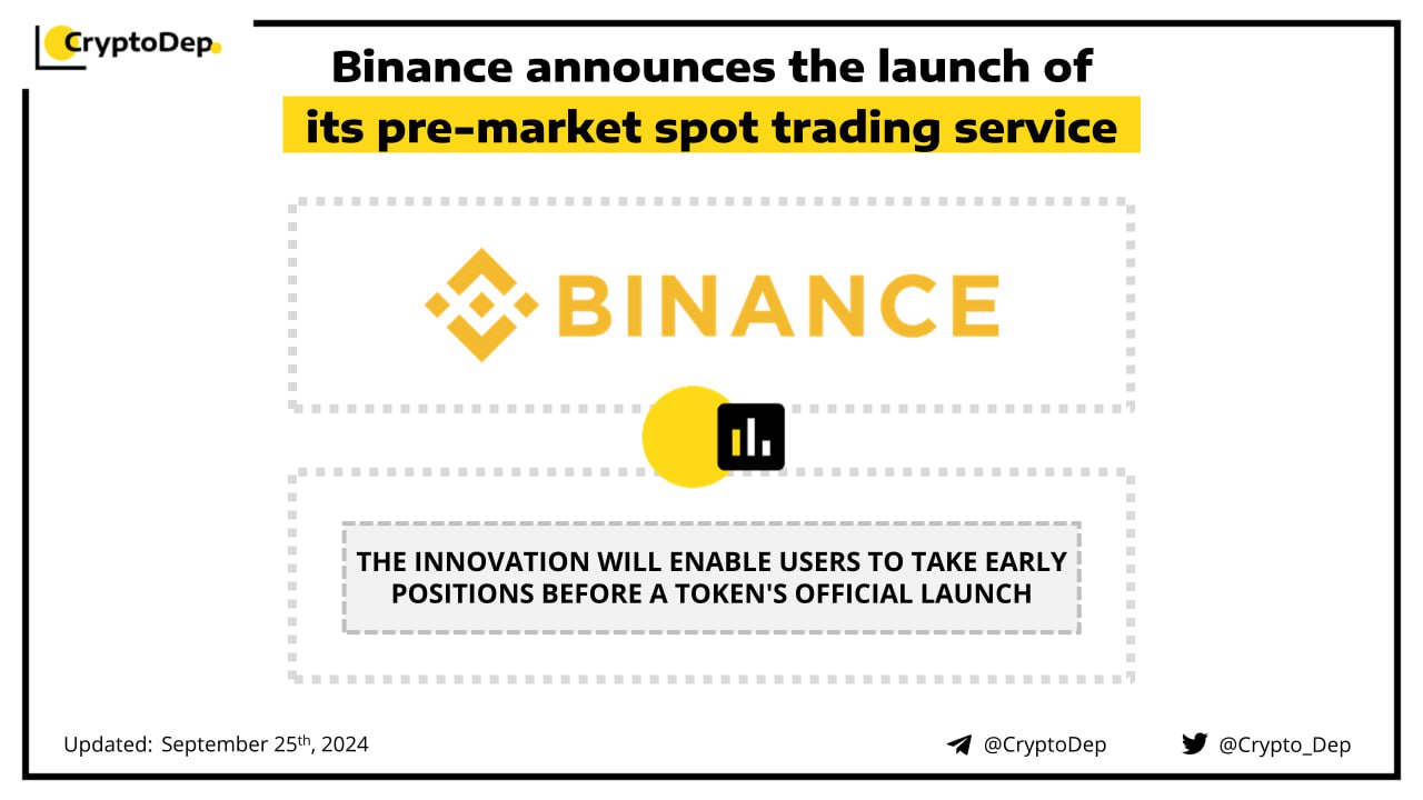 Binance has rolled out a pre-market spot trading service, enabling users to take early positions before a token's official launch. In contrary to other crypto exchanges that typically facilitate pre-market trading via derivatives, Binance will have actual tokens for users to trade during pre-market. The Binance Pre-Market service is a joint effort between Binance Spot and Binance Launchpool, which allows users to acquire new project tokens by staking $BNB and other tokens.