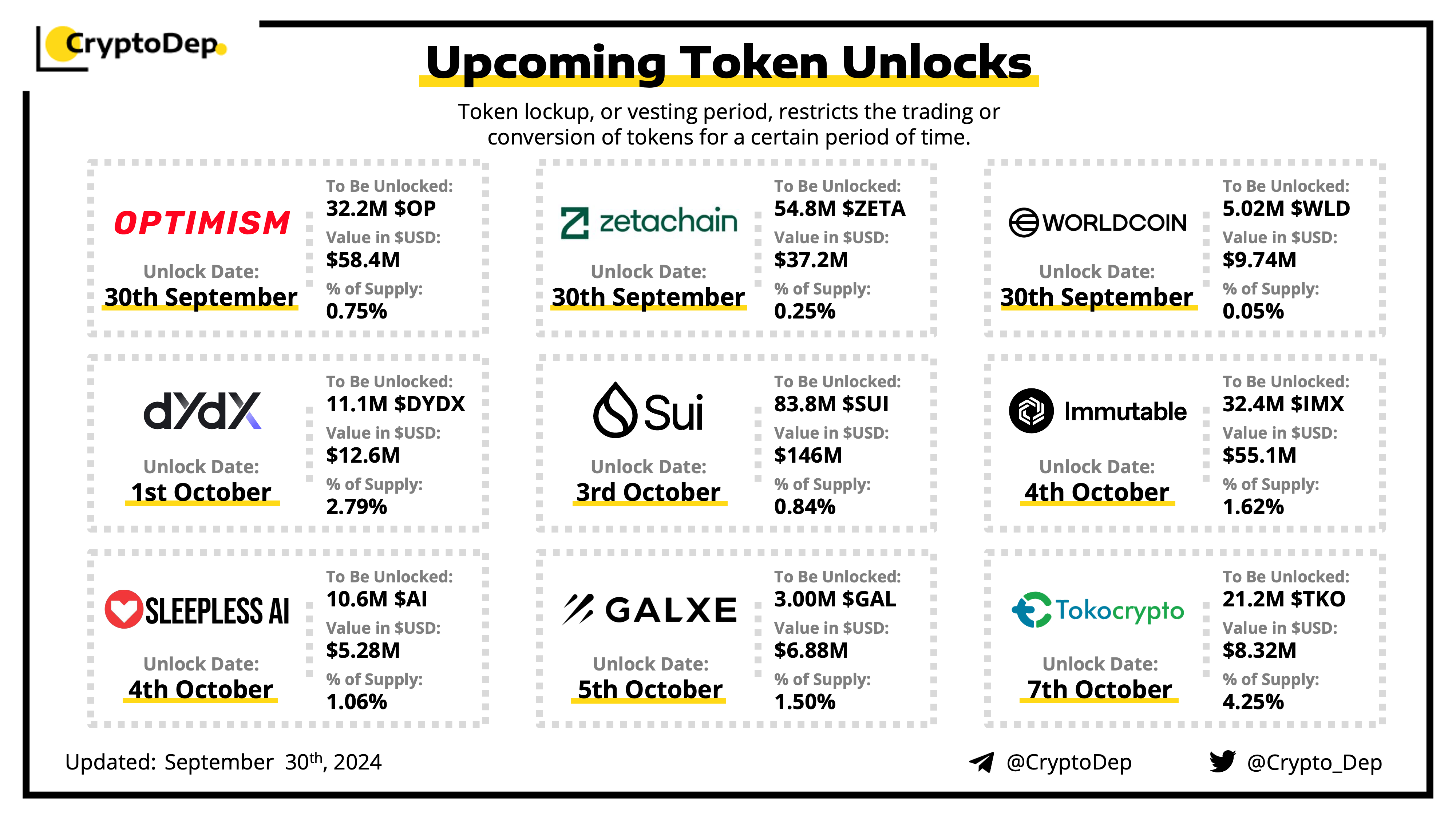 Let's take a look at the compilation of major upcoming token unlocks, diving into details such as dates, amounts, and projects related to tokens that are currently locked up, but will soon be released to the market. During this week, $SUI, $OP, $IMX, $ZETA, and $DYDX will have the biggest unlocks.