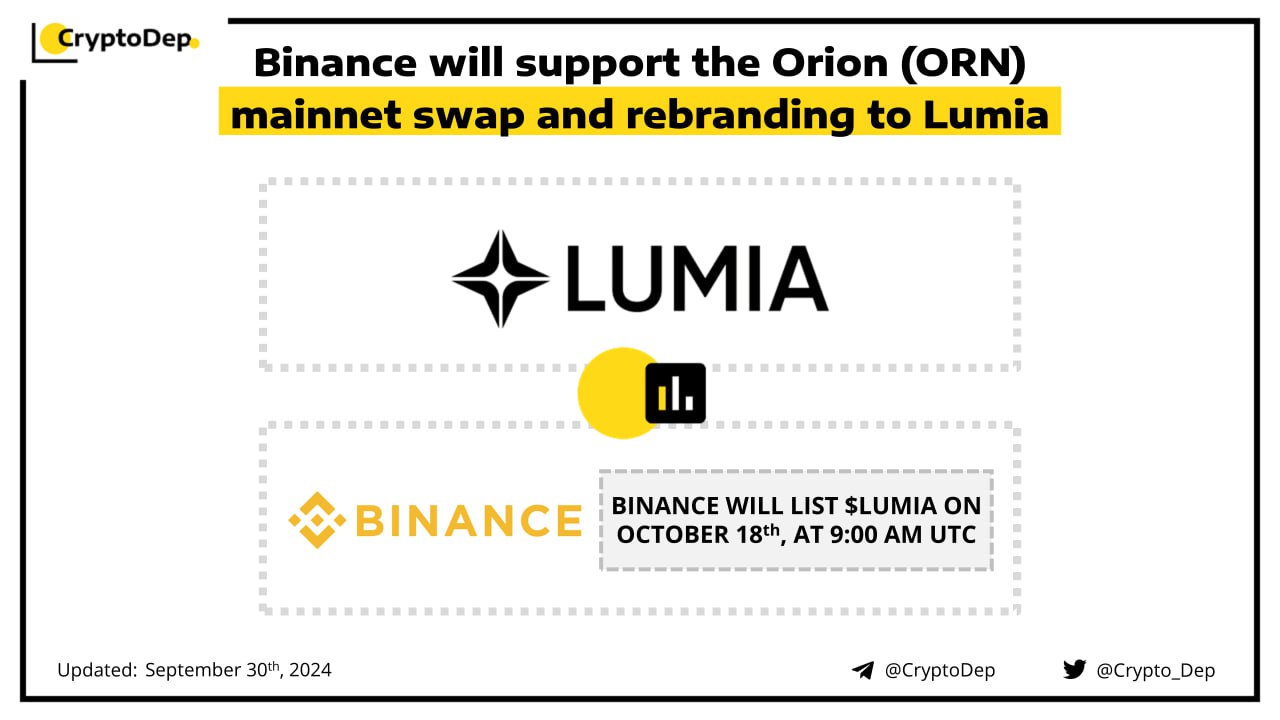 ββBinance will support the Orion (ORN) mainnet swap and rebranding to Lumia