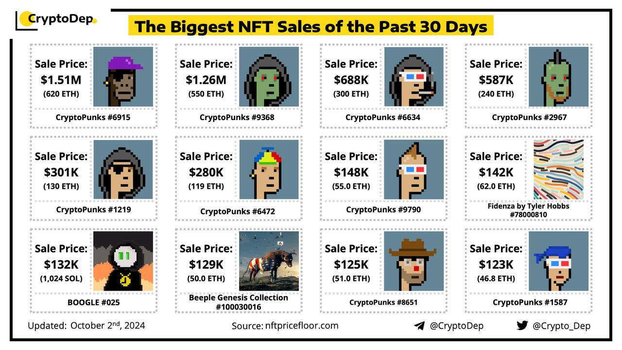 In this post, we highlight the largest Non-Fungible Token (NFT) sales that have occurred over the past month, delving into the details of each sale, including the specific NFT that was sold, and the price it fetched. Data from NFTPricefloor.