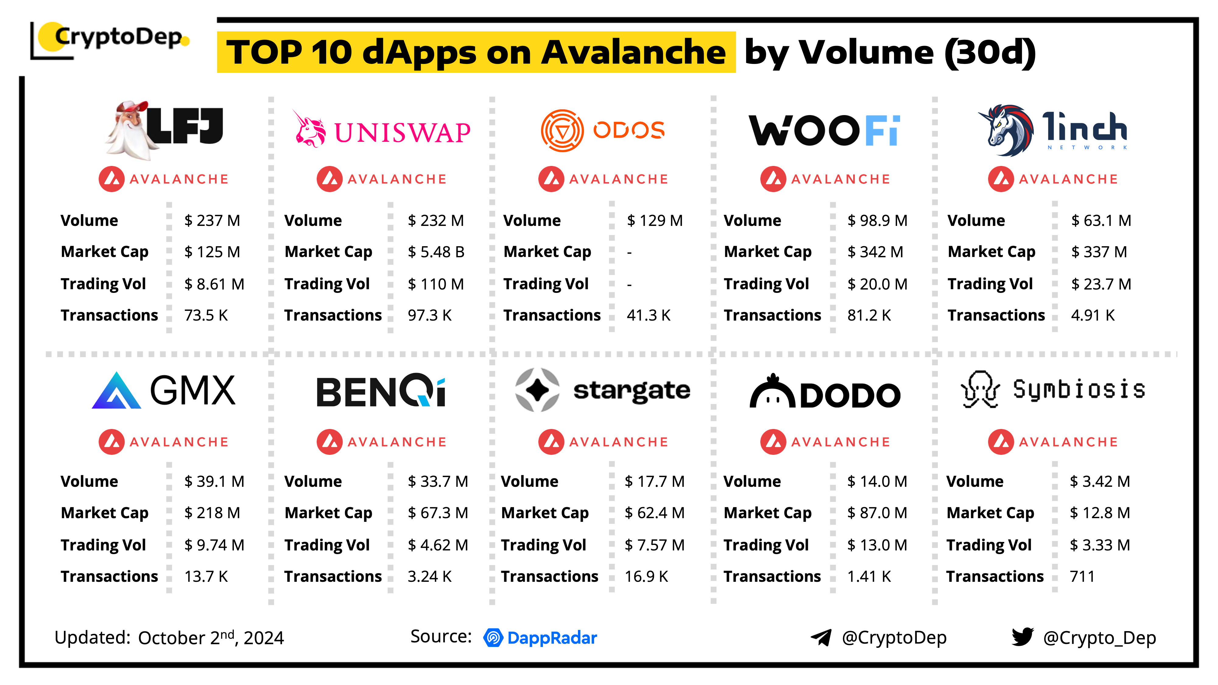 A decentralized application (dApp) is a program built on blockchain that combines a smart contract and a front-end user interface. We present the top dApps on #Avalanche by volume in the last 30 days, according to the data from DappRadar.