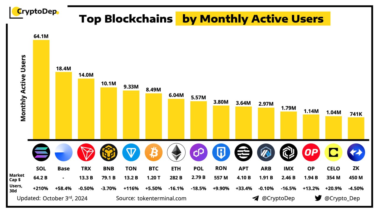 Monthly active users measure the number of distinct addresses interacting with blockchains' relevant contracts. According to the data from TokenTerminal, Solana, Base, Tron, BNB Chain, and TON have drawn the largest numbers of users lately.