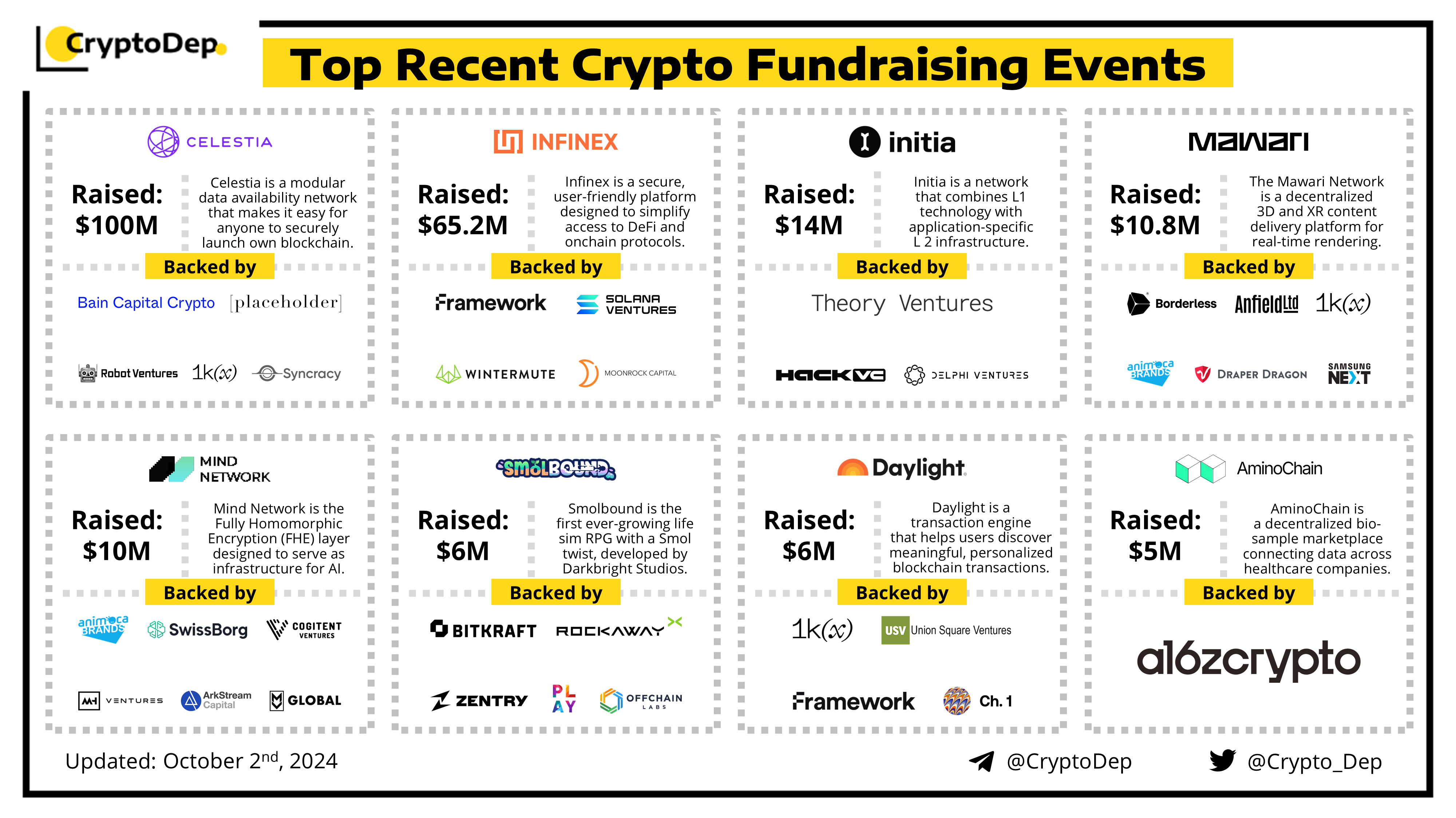 Presenting a list of some recent crypto fundraising events, backed by well-known investors such as a16z crypto, Animoca Brands, Borderless, 1kx, Bitkraft, Framework Ventures, Hack VC, Delphi Ventures, Bain Capital, Solana Ventures, Offchain Labs, Samsung Next, and others. Let's take a look!