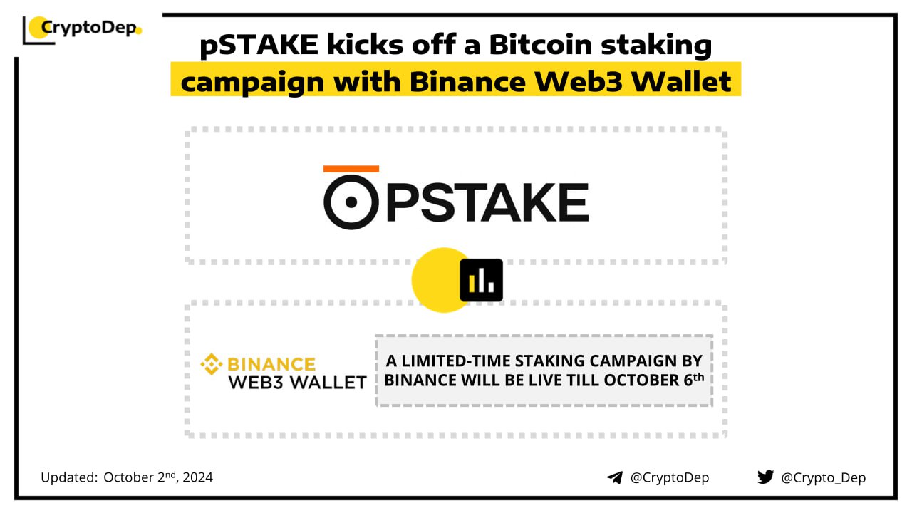 pSTAKE has announced the launch of a Bitcoin staking campaign jointly with Binance Web3 Wallet. The limited-time staking/farming campaign by Binance between October 1st to October 6th 2024. Participants can stake a minimum of 0.005 $BTC (on the Bitcoin Mainnet Network) using the Binance Web3 Wallet to share a reward pool of 100K $PSTAKE tokens. pSTAKE Finance is a Bitcoin yield protocol, backed by Binance Labs.