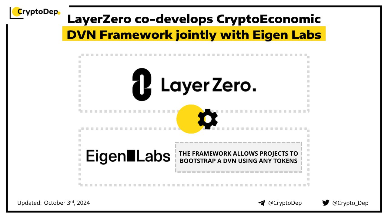 LayerZero Labs, in partnership with Eigen Labs, is introducing a framework for CryptoEconomic Decentralized Verifier Networks (DVNs). The innovation allows projects to easily bootstrap a DVN on EigenLayer using ANY tokens, operators, and slashing rules. LayerZero Labs DVN will become the first DVN to utilize this framework, accepting ETH, ZRO, and EIGEN as staking assets.