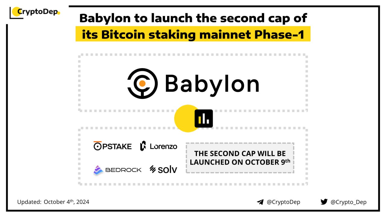 Babylon, a Bitcoin staking protocol, will launch the second cap of its Bitcoin staking mainnet Phase-1 on October 9th, around 11:00 AM UTC. Users can also participate in a joint $BTC staking campaign of Babylon and Binance Web3 Wallet. Babylon is backed by Paradigm, Polychain Capital, OKX Ventures, and Hack VC among others with the total amount raised of $96M.