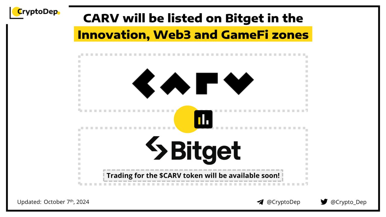 CARV has unveiled its upcoming listing on the Bitget exchange with more details to be announced soon. Trading for $CARV will be available soon in the Innovation, Web3, and GameFi Zone. CARV is a modular data layer facilitating data exchange and value distribution across gaming and AI. The project is backed by Animoca Brands, OKX Ventures, IOSG, and others.