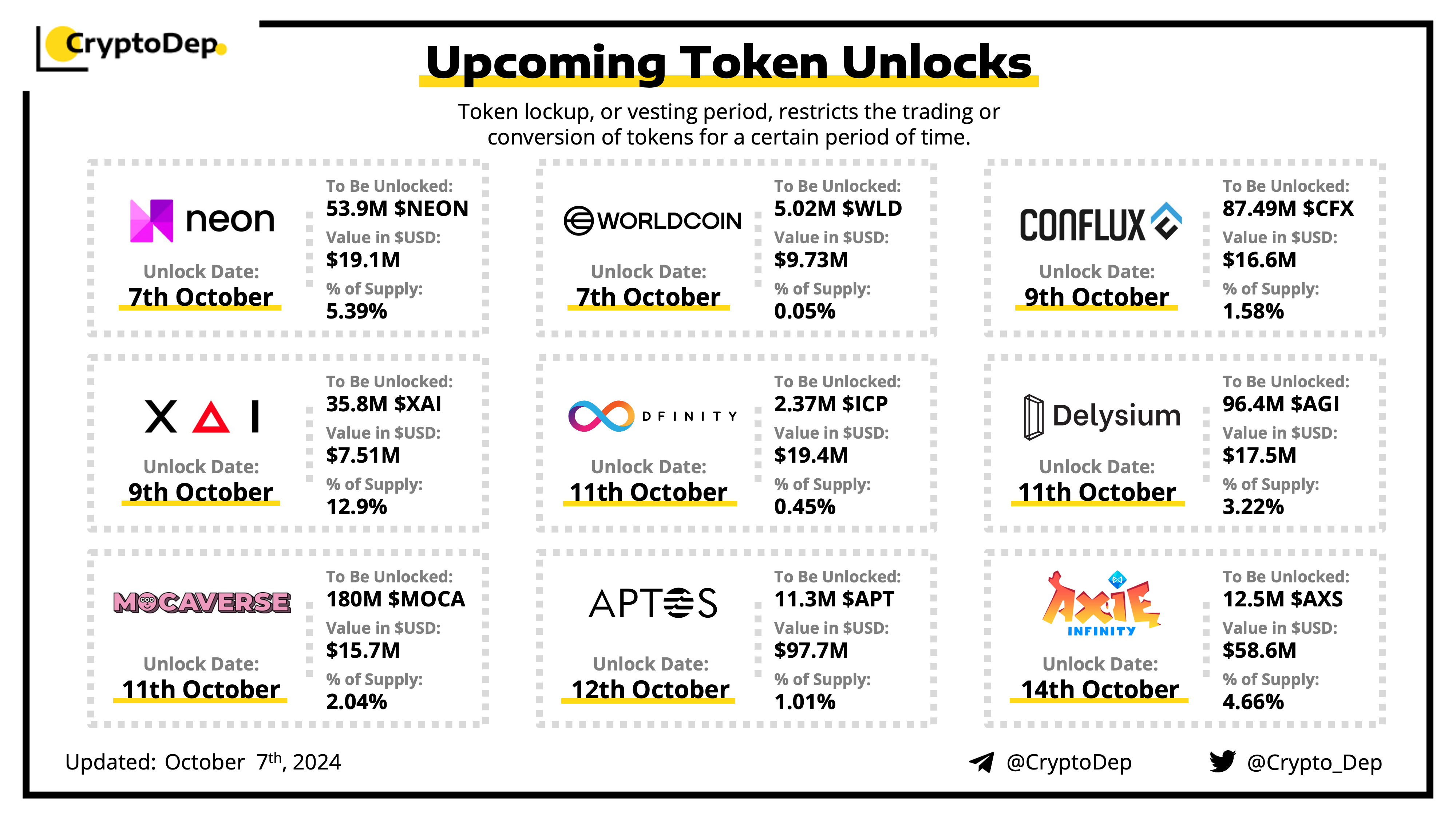 Let's take a look at the compilation of major upcoming token unlocks, diving into details such as dates, amounts, and projects related to tokens that are currently locked up, but will soon be released to the market. During this week, $APT, $AXS, $ICP, $NEON, and $AGI will have the biggest unlocks.