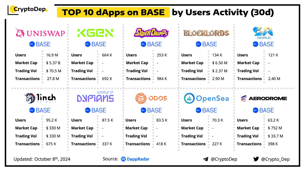 A decentralized application (dApp) is a program built on blockchain that combines a smart contract and a front-end user interface. We present the top dApps on #Base by users activity in the last 30 days, according to the data from DappRadar.