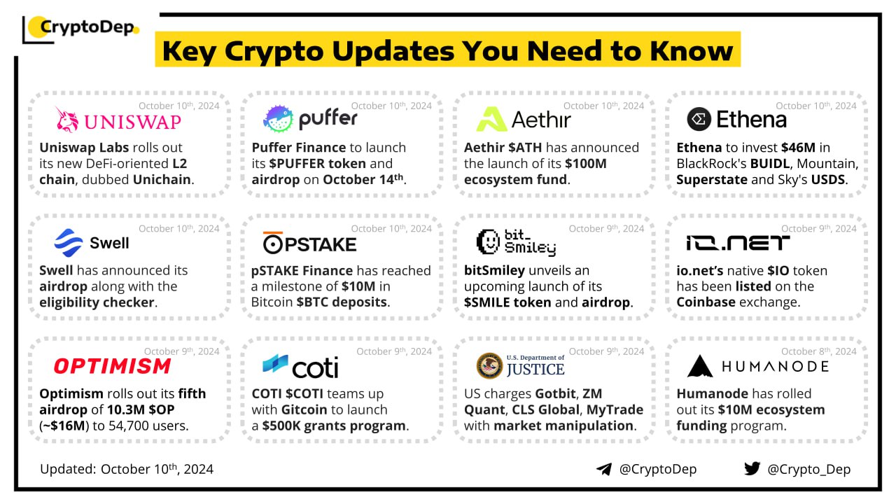 Puffer Finance has introduced $PUFFER tokenomics and airdrop details. A total of 75M tokens (7.5% of the total supply) is allocated for Crunchy Carrot Quest Season One airdrop. The $PUFFER token will have a total token supply of 1B and will empower Puffer's community to participate in key decisions, guiding Pufferβs future. Moreover, the project will allocate another 55M tokens (5.5% of the total supply) to Airdrop Season 2. Backed by Binance Labs, Coinbase Ventures, Consensys, and others, Puffer Finance is an Ethereum liquid restaking protocol with $1.30B in total value locked.