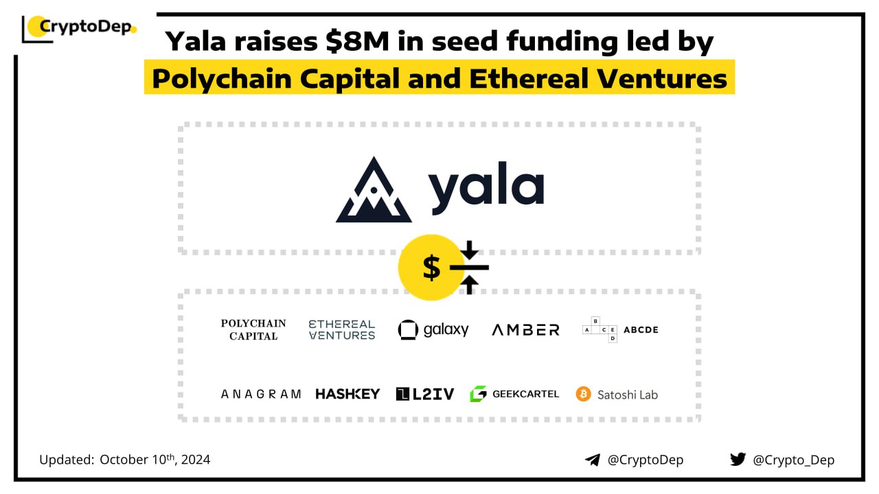 Yala has closed its $8M seed investment led by Polychain Capital and Ethereal Ventures. Additional round participants included Galaxy Vision Hill, Anagram, Amber Group, ABCDE, Ambush Capital, GeekCartel, Hashkey Capital, L2 Iterative Ventures (L2IV), SatoshiLab, UpHonest Capital, UTXO Management, 280 Capital, and more. Yala is building a Bitcoin liquidity protocol to unlock the full strength of Bitcoin liquidity, connecting it to multi-chain ecosystems through the $YU bitcoin-backed stablecoin.