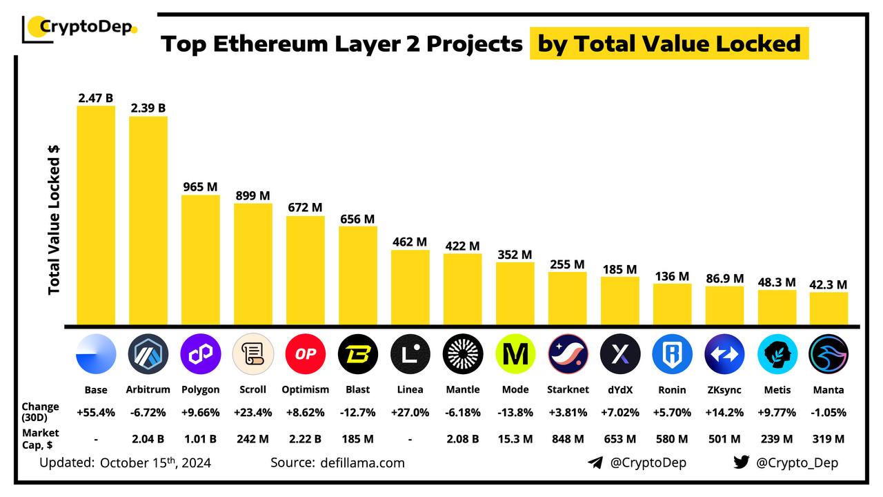 TVL is the overall value of crypto assets deposited in Ethereum Layer 2 networks. The overall TVL among all projects now equals $38.1B with Base, Arbitrum $ARB, Polygon $POL, Scroll $SCR, and Optimism $OP making the top leaders.