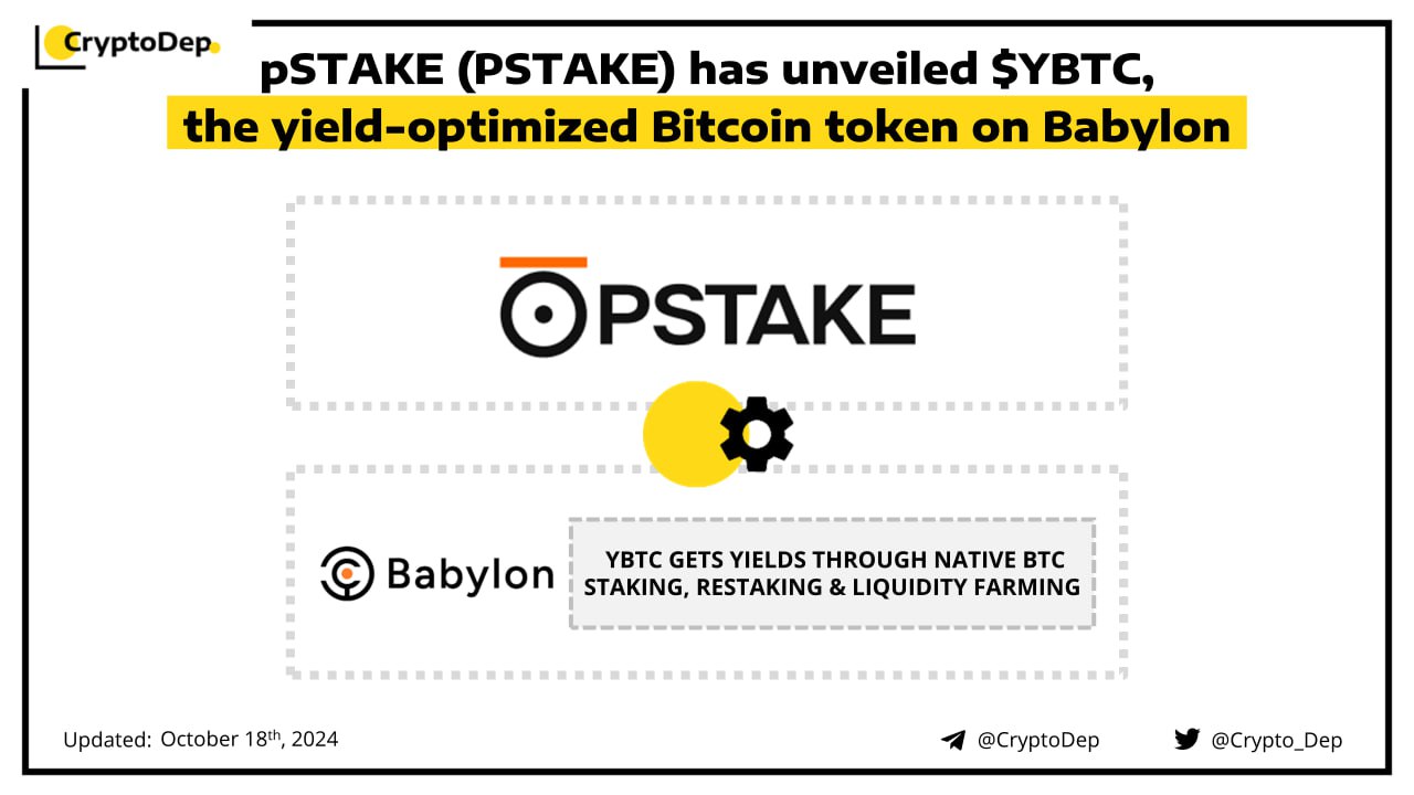 pSTAKE has introduced $YBTC, a yield-optimized token that is expected to go live in mid-November. The LST gets yields through native BTC staking, restaking, and liquidity farming across multiple DeFi ecosystems. The token represents usersβ BTC deposits into pSTAKE that is in turn staked into Babylon to earn Bitcoin Staking yields. pSTAKE Finance is a Bitcoin yield protocol, backed by Binance Labs.
