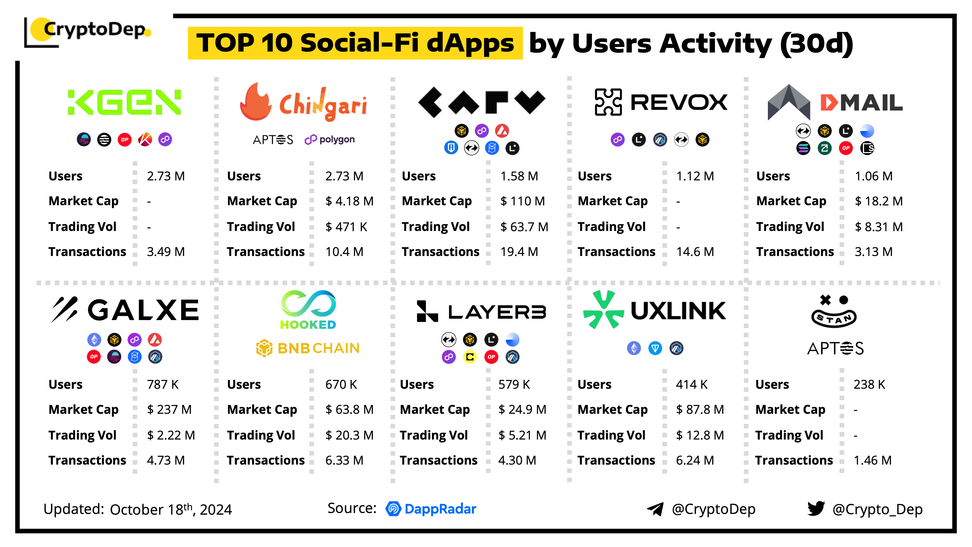 ββTOP 10 Social-Fi dApps by Users Activity (30d)