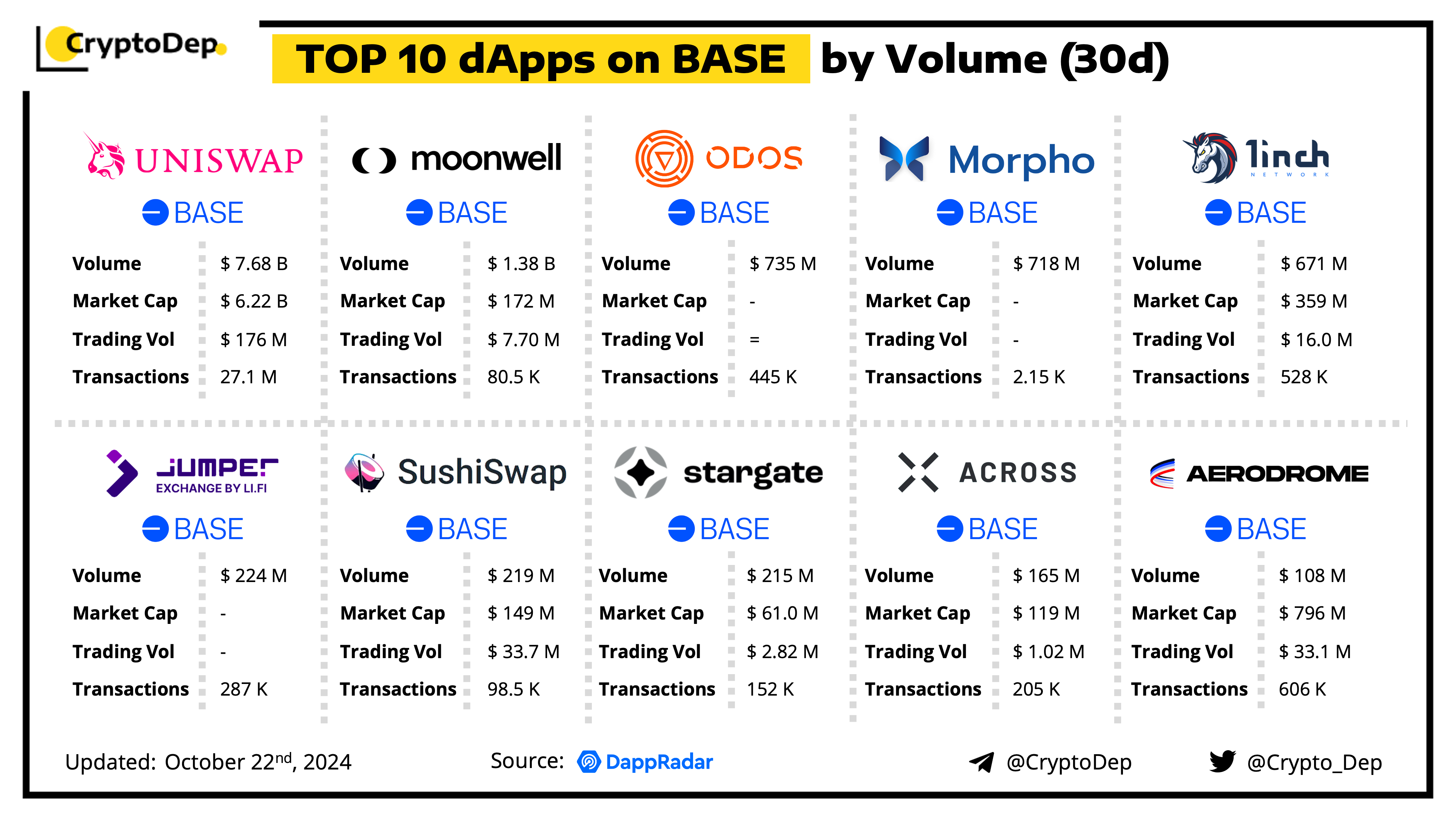 A decentralized application (dApp) is a program built on blockchain that combines a smart contract and a front-end user interface. We present the top dApps on #Base by volume in the last 30 days, according to the data from DappRadar.