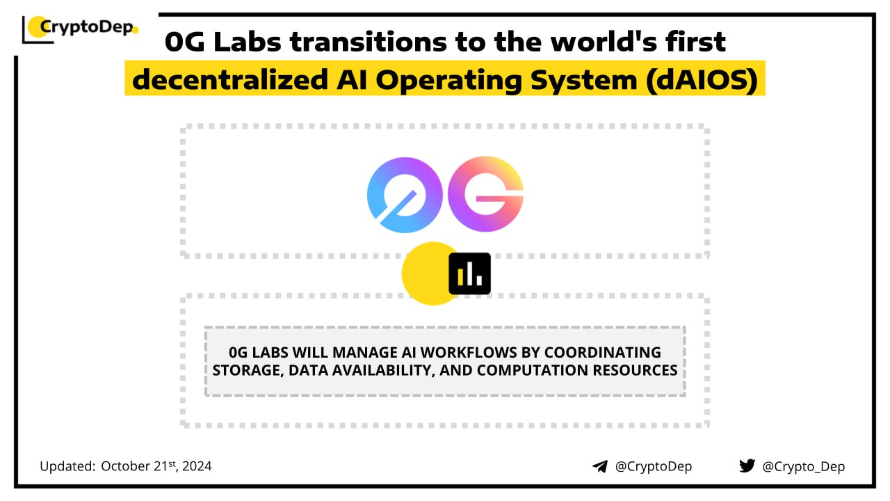 0G Labs has announced its shift to the world's first Decentralized AI Operating System (dAIOS). Through this innovation, 0G will manage AI workflows by coordinating storage, data availability, and computation resources across a permissionless network. Moreover, the project will launch 0G DA, its scalable and programmable data availability layer, and 0G Serving, a framework that supports AI model inference, data retrieval, and training tasks. Earlier in March, 0G Labs raised $35M from Hack VC, OKX Ventures, P2 Ventures, Alliance DAO, Foresight Ventures, Animoca Brands, GSR,and others.