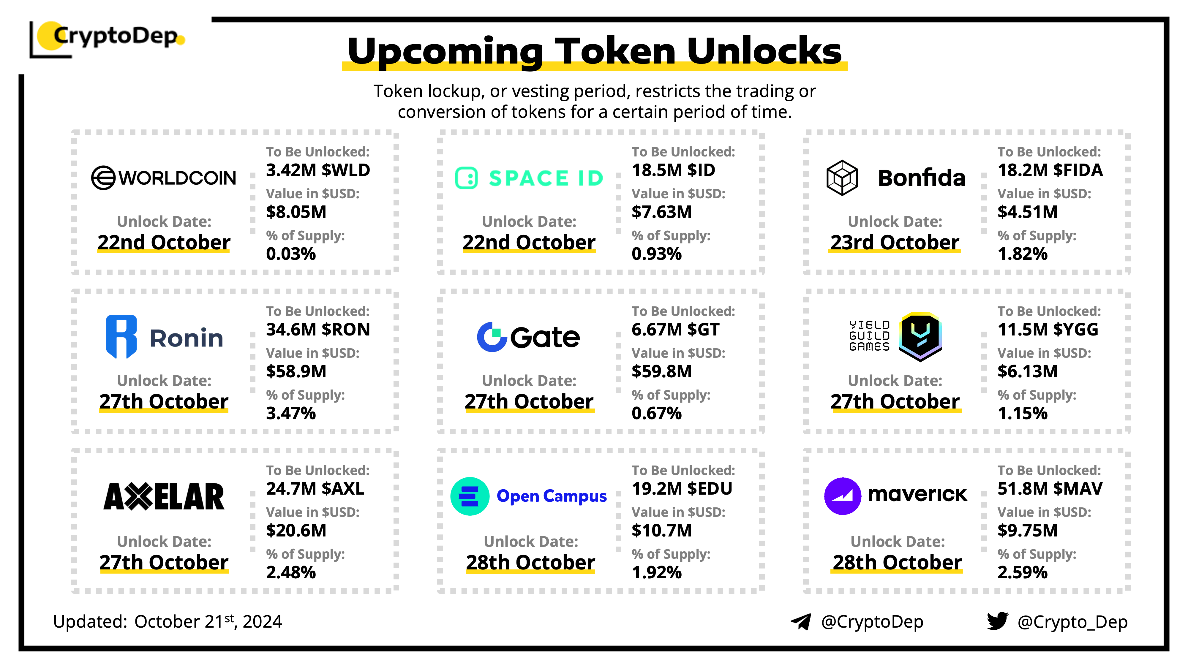 Let's take a look at the compilation of major upcoming token unlocks, diving into details such as dates, amounts, and projects related to tokens that are currently locked up, but will soon be released to the market. During this week, $GT, $RON, $AXL, $EDU, and $MAV will have the biggest unlocks.