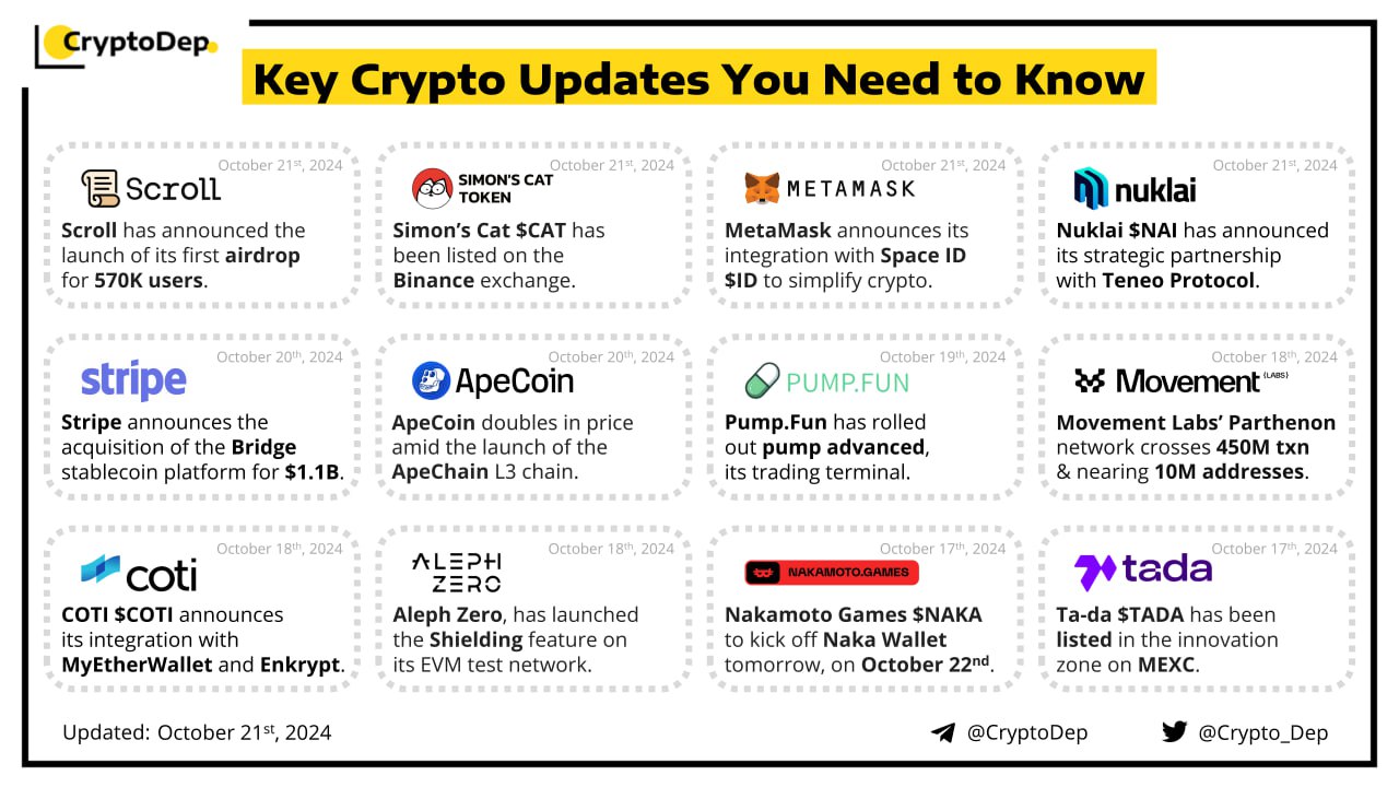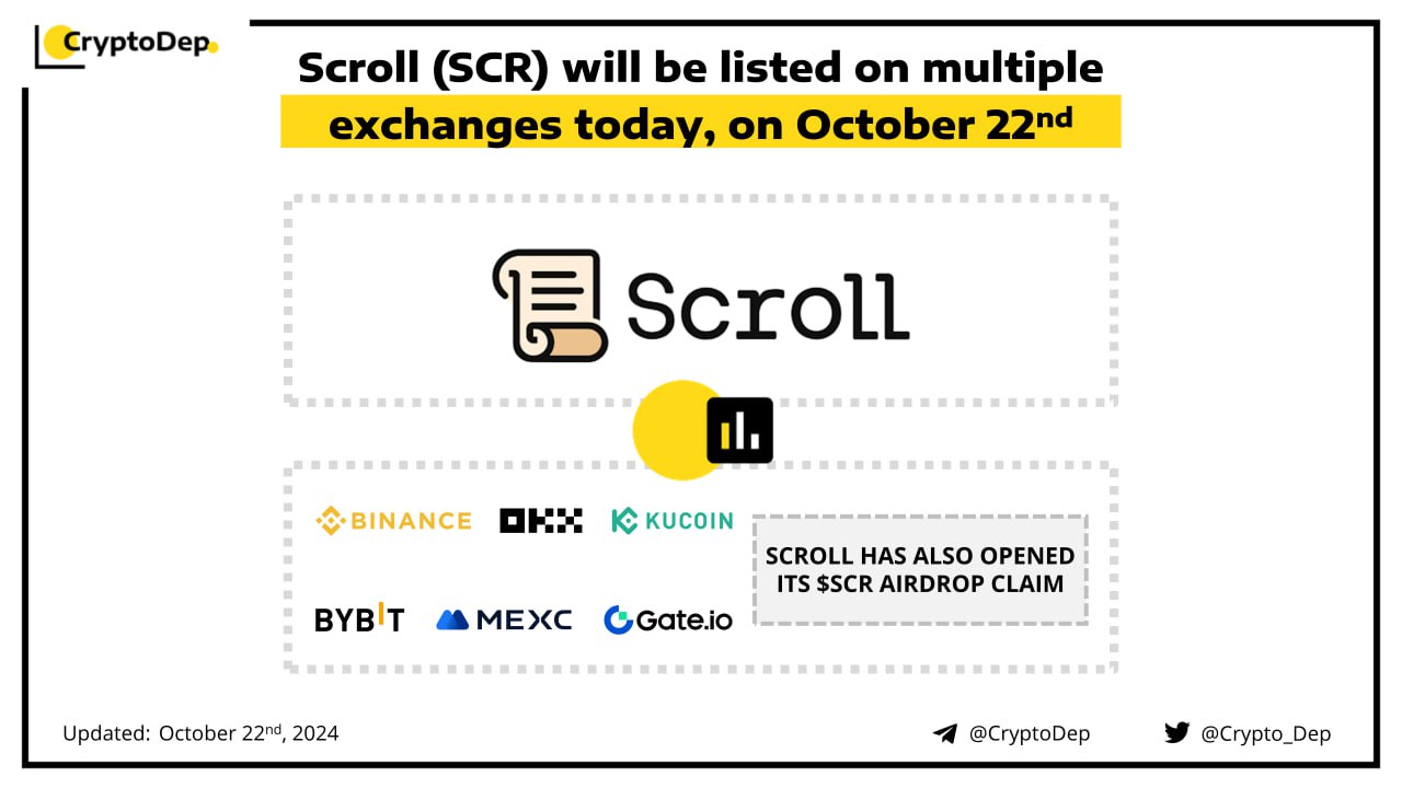 Trading for $SCR will start on Binance, KuCoin, OKX, Bitget, Bybit, BingX, MEXC, HTX, Gate, and other exchanges on October 22nd, at 8:00 AM UTC. The project has also rolled out the $SCR airdrop claiming portal. Earlier this month, Scroll was launched on Binance Launchpool and Pre-market trading. Scroll is a Bytecode-level compatible zkEVM rollup, backed by Polychain Capital, Sequoia China, Bain Capital Crypto, and others, with a $80M total raise.