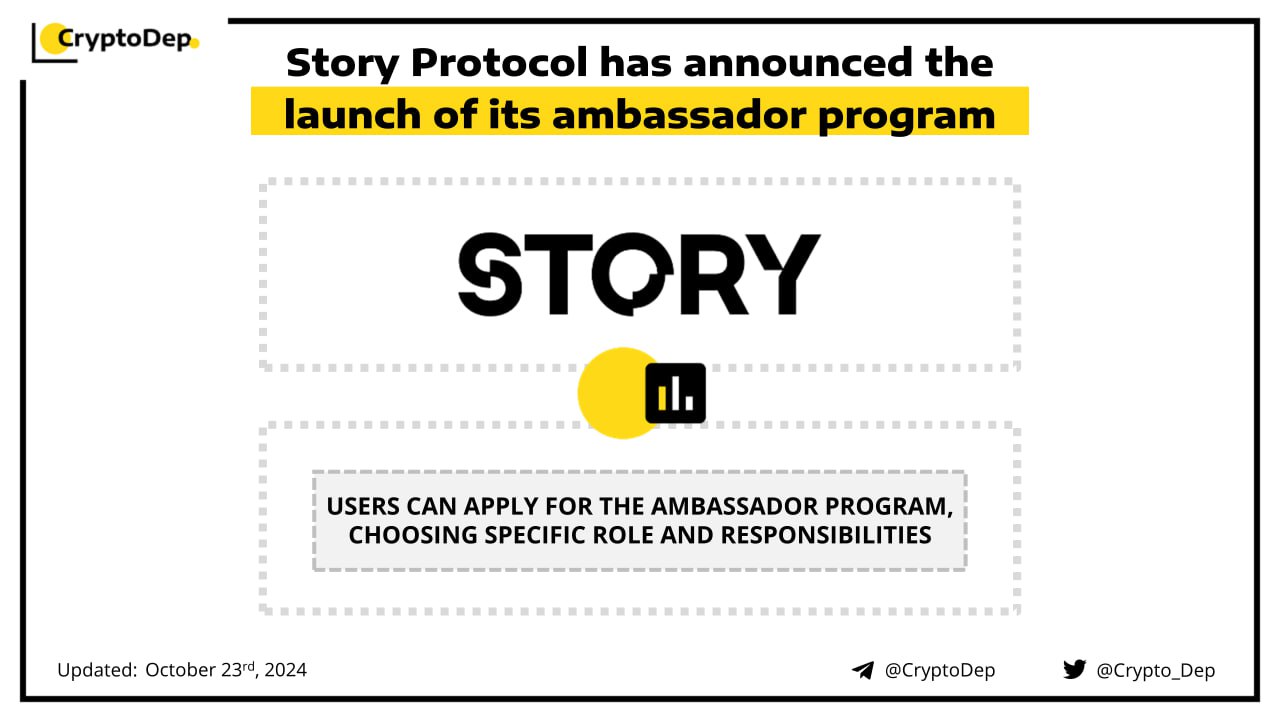 Story Protocol kicks off its ambassador program, designed to empower exceptional community leaders to serve as an extension of the Story team. Users can now apply for the program, choosing one of the key roles, including community moderators, international representatives & delegates, technical ambassadors, and creative ambassadors among other roles. Selected applicants will participate in a two-week trial period as candidates, followed by a two-month early assessment phase and a one-year role period.