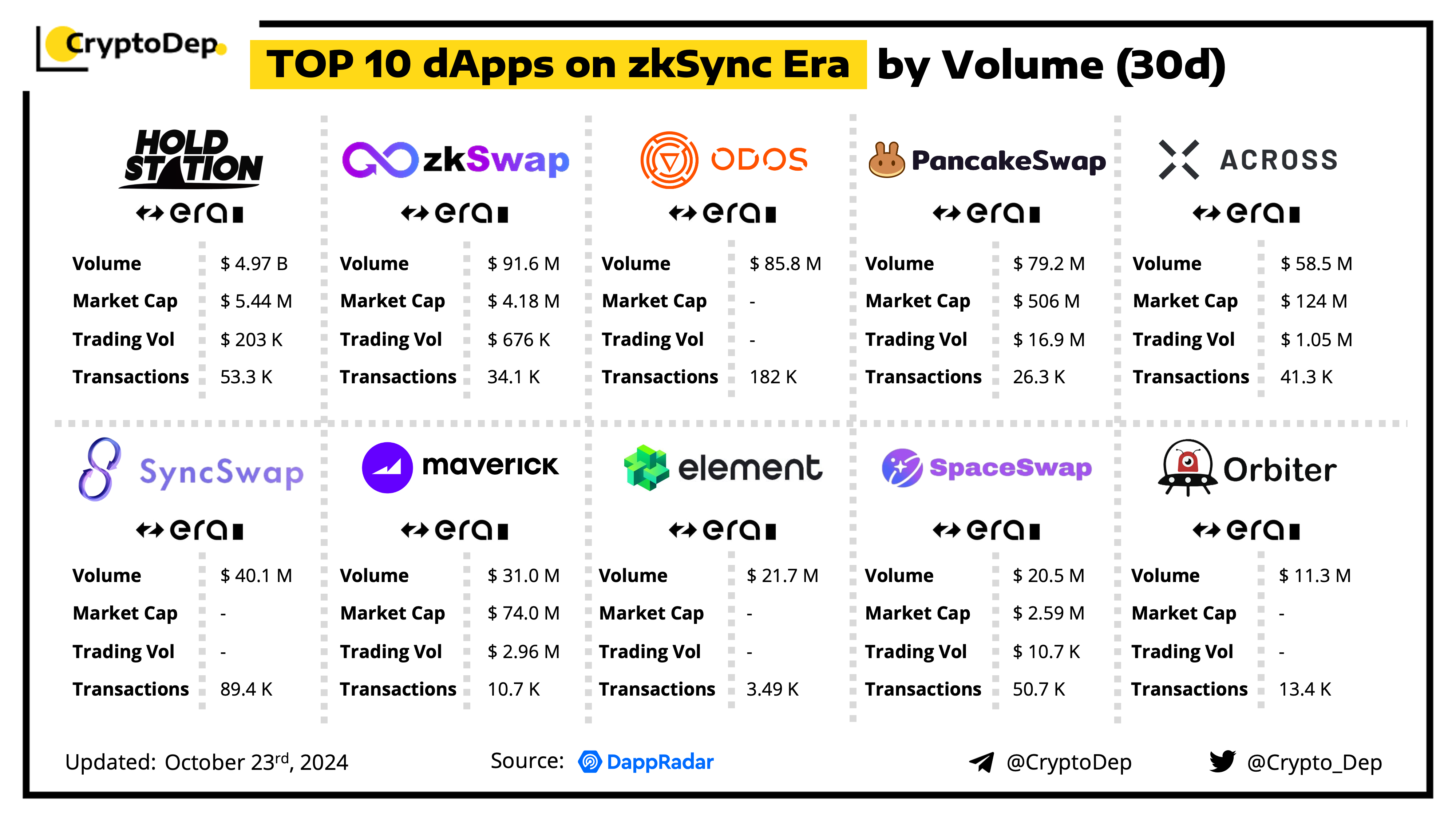A decentralized application (dApp) is a program built on blockchain that combines a smart contract and a front-end user interface. We present the top dApps on zkSync Era by volume in the last 30 days, according to the data from DappRadar.