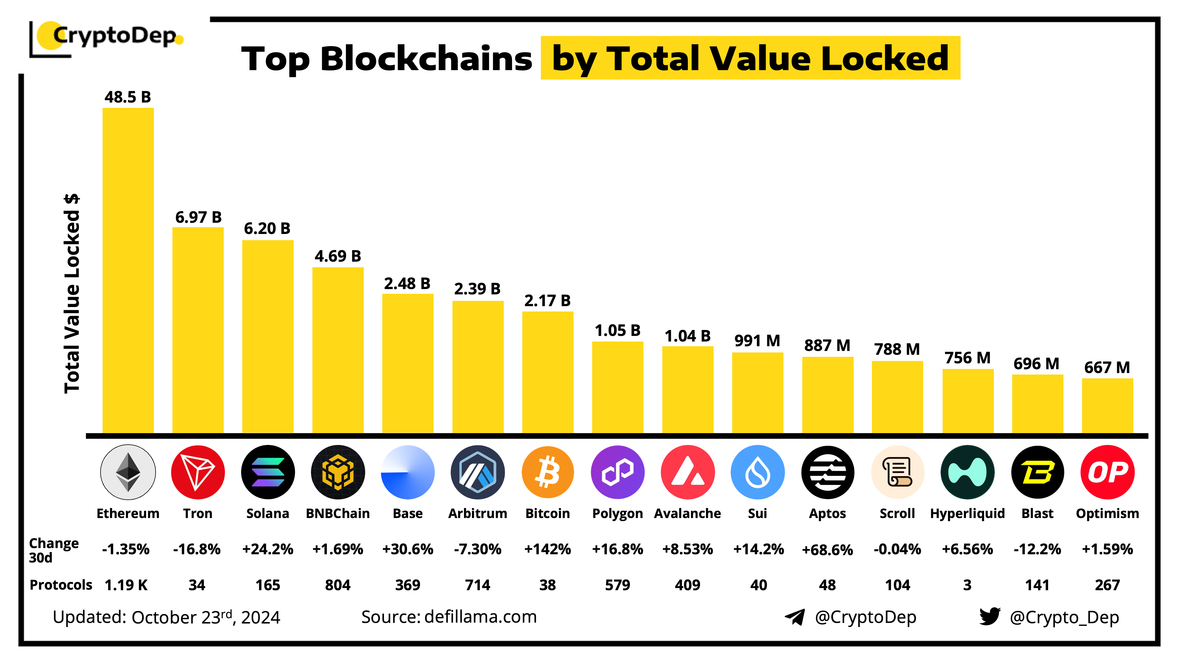 The overall value of crypto assets deposited in blockchain protocols is about $88.4B Ethereum $ETH, Tron $TRX, Solana $SOL, BNB Chain $BNB, and Base are among the leaders, according to the data from DeFillama.