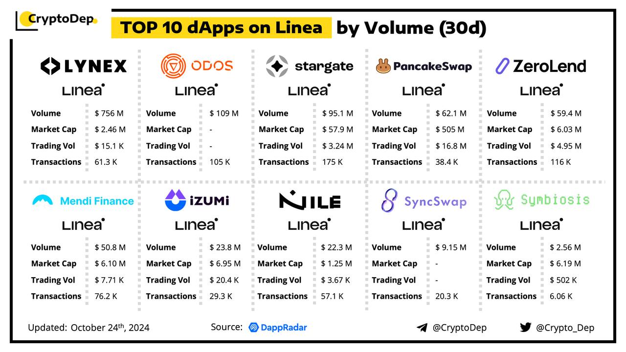 A decentralized application (dApp) is a program built on blockchain that combines a smart contract and a front-end user interface. We present the top dApps on #Linea by volume in the last 30 days, according to the data from DappRadar.