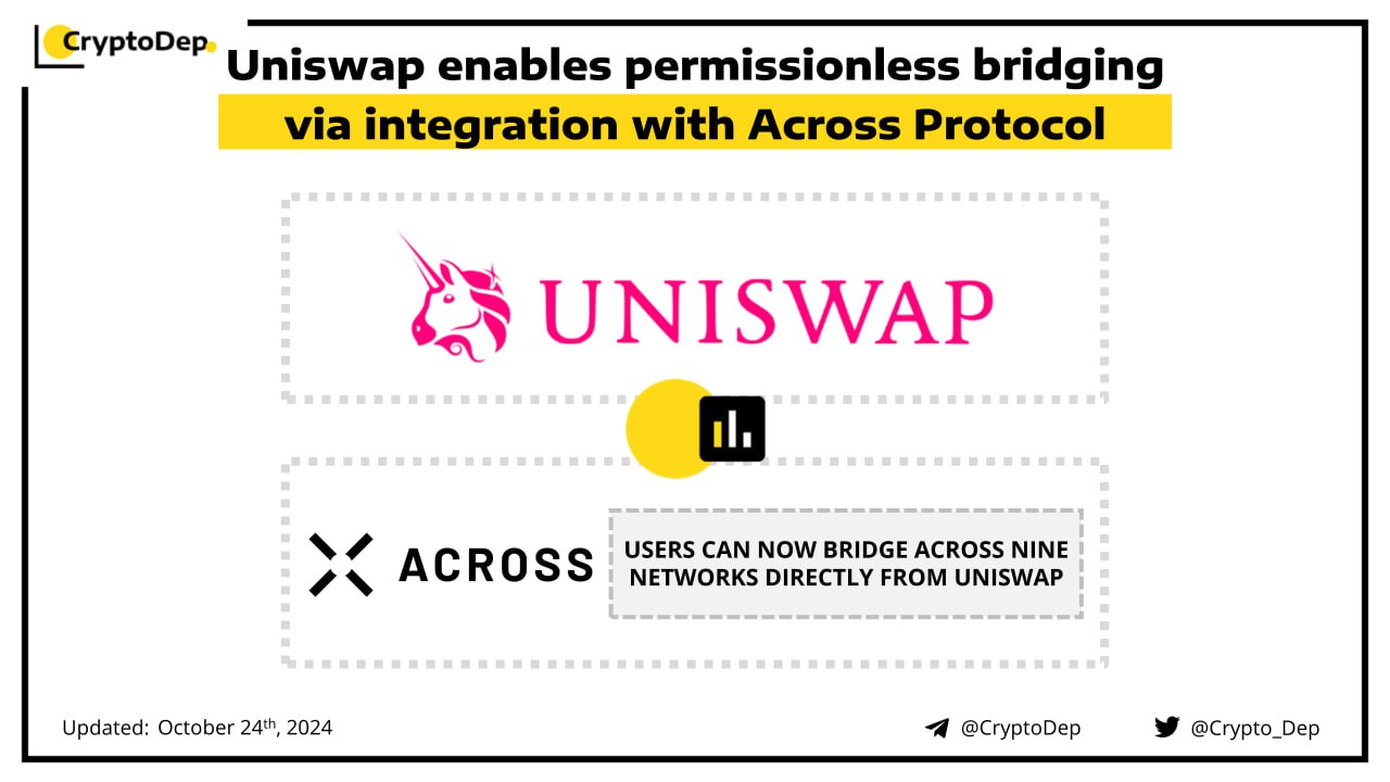 Uniswap has announced the launch of permissionless bridging, powered by Across Protocol. This innovation allows users to bridge their assets across nine networks directly from the Uniswap Interface and Uniswap Wallet. At launch, bridging will be available for Ethereum, Base, Arbitrum, Polygon, OP Mainnet, Zora, Blast, World Chain, and ZKsync.