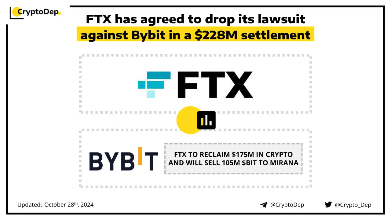 FTX exchange has agreed to drop its lawsuit against Bybit, its executives, and its investment arm Mirana. The settlement would allow the defunct cryptocurrency exchange to collect around $228M. The FTX bankruptcy estate sued Bybit last November, alleging that it used its βVIPβ access to FTX to withdraw hundreds of millions in cash and digital assets on the eve of FTX collapse in 2022.