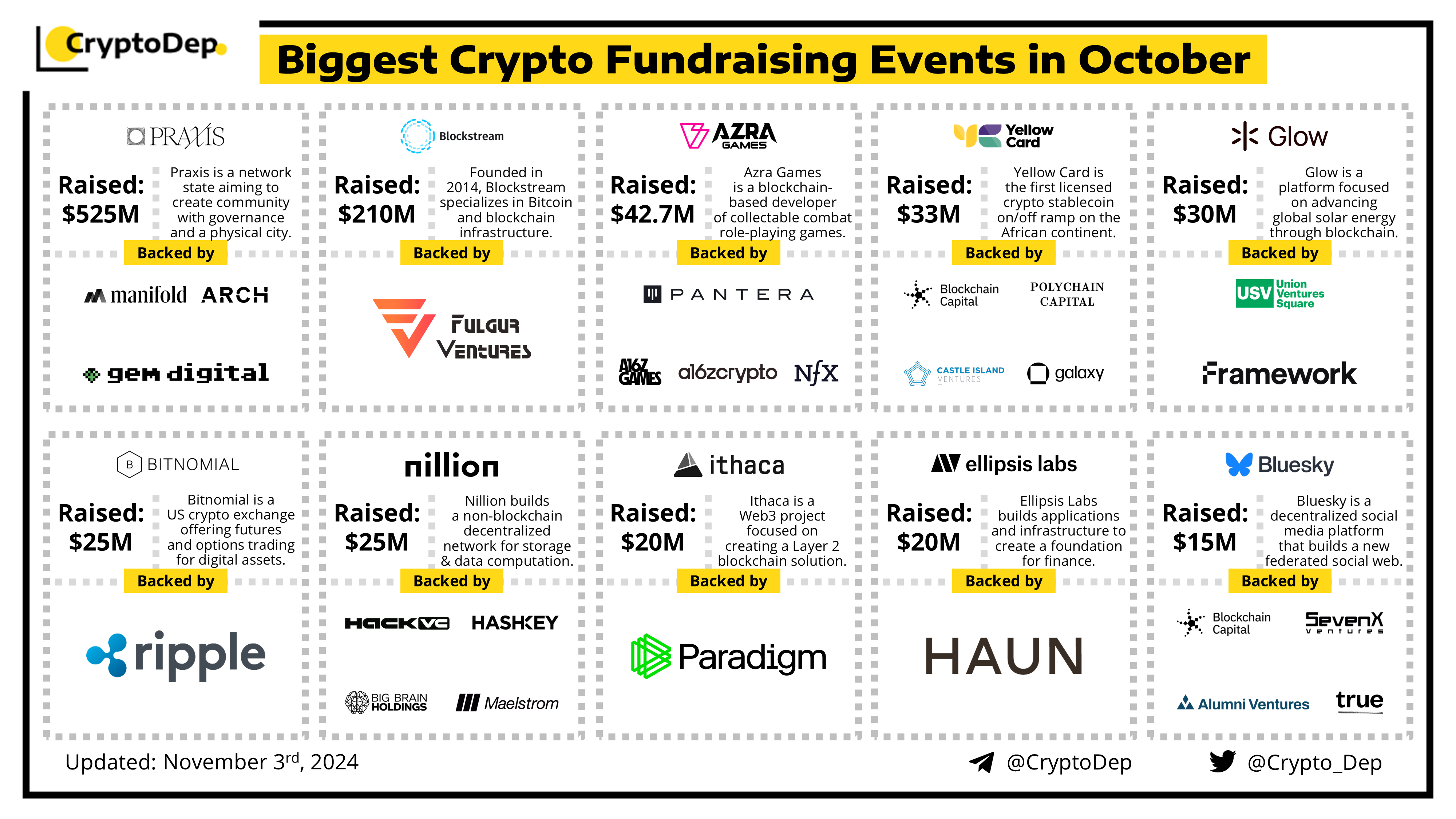 Presenting a list of the biggest crypto fundraising rounds in October 2024, backed by well-known investors such as Paradigm, a16z crypto, Pantera Capital, Hack VC, Blockchain Capital, Polychain Capital, Haun Ventures, Hashkey, Maelstrom, Big Brain Holdings, Framework Ventures, Ripple, and others. Let's take a look!