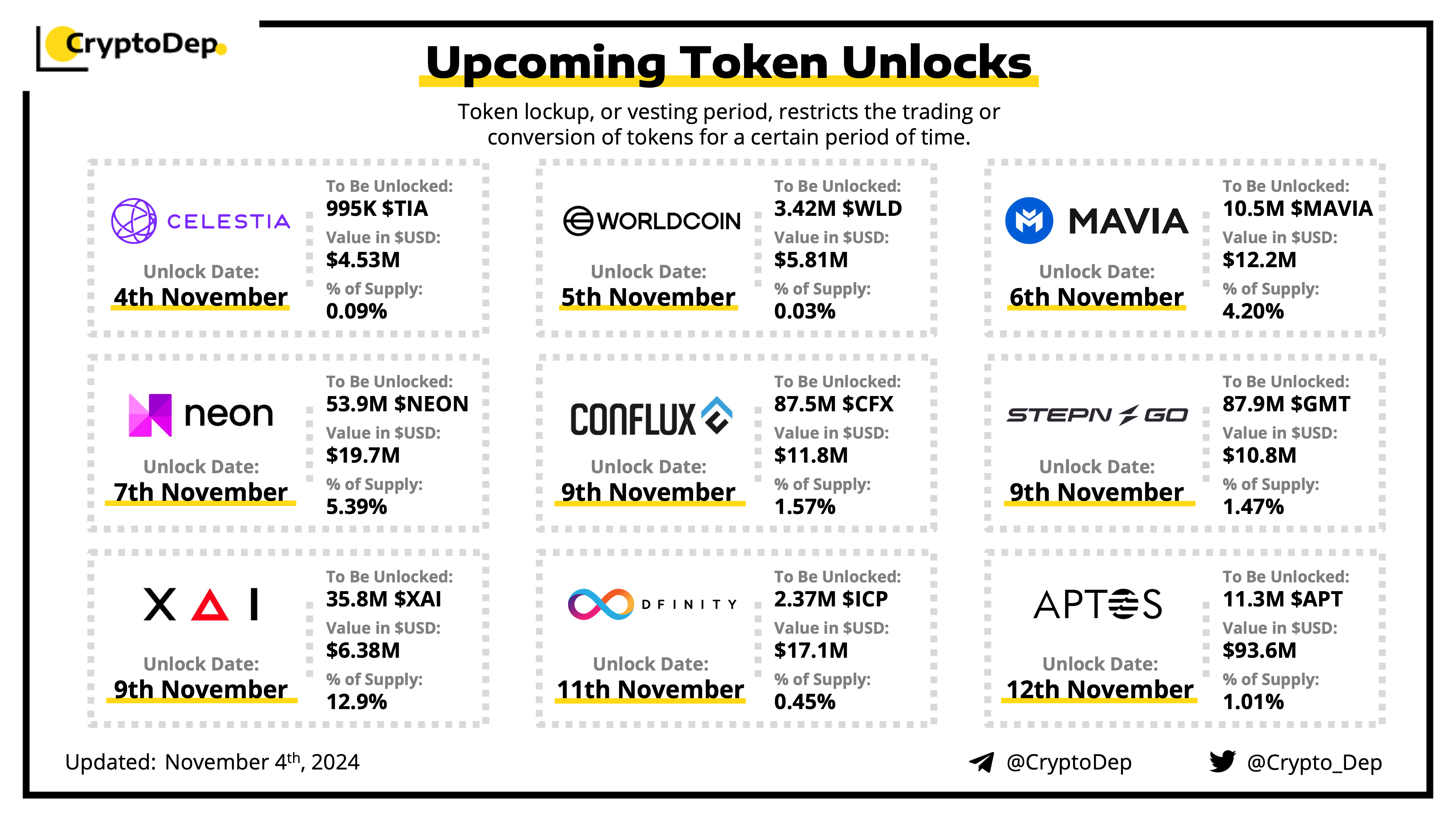 Let's take a look at the compilation of major upcoming token unlocks, diving into details such as dates, amounts, and projects related to tokens that are currently locked up, but will soon be released to the market. During this week, $APT, $NEON, $ICP, $MAVIA, and $CFX will have the biggest unlocks.