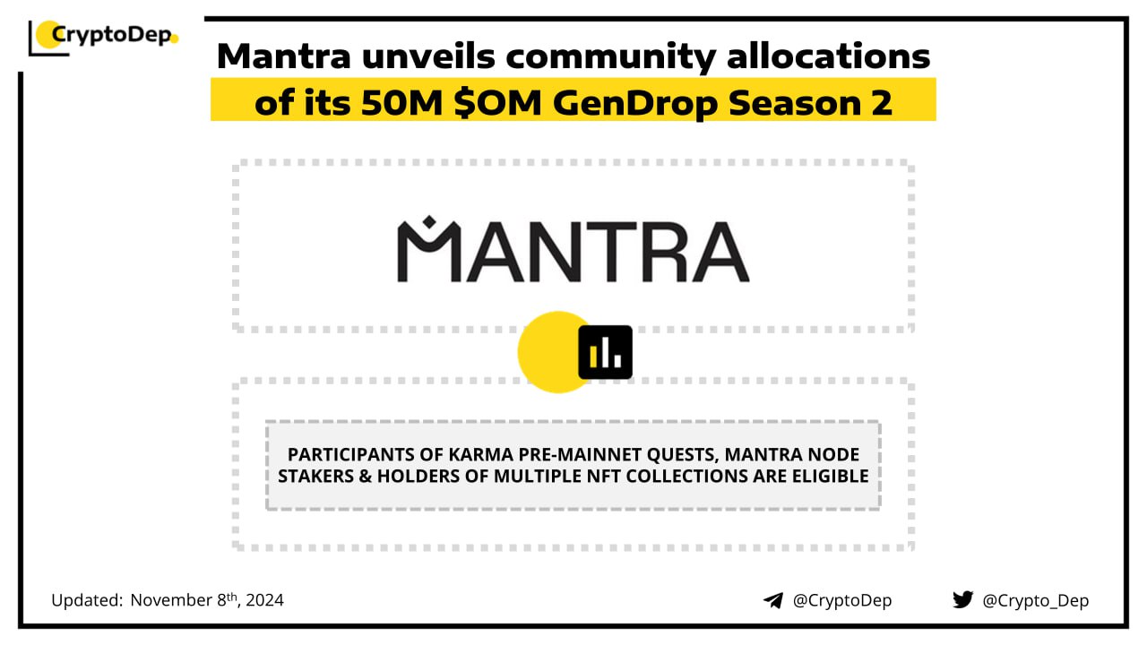 MANTRA will distribute 50M $OM ($69M) to 350,000 users via GenDrop Season 2. Among eligible users are participants of KARMA pre-mainnet quests, Galxe season 1, MANTRA node stakers, and holders of multiple NFT collections. Token rewards will be subject to a 1-month cliff, followed by 11 months of linear vesting. MANTRA Chain is the RWA Layer 1 Blockchain, capable of adherence and enforcement of real-world regulatory requirements.