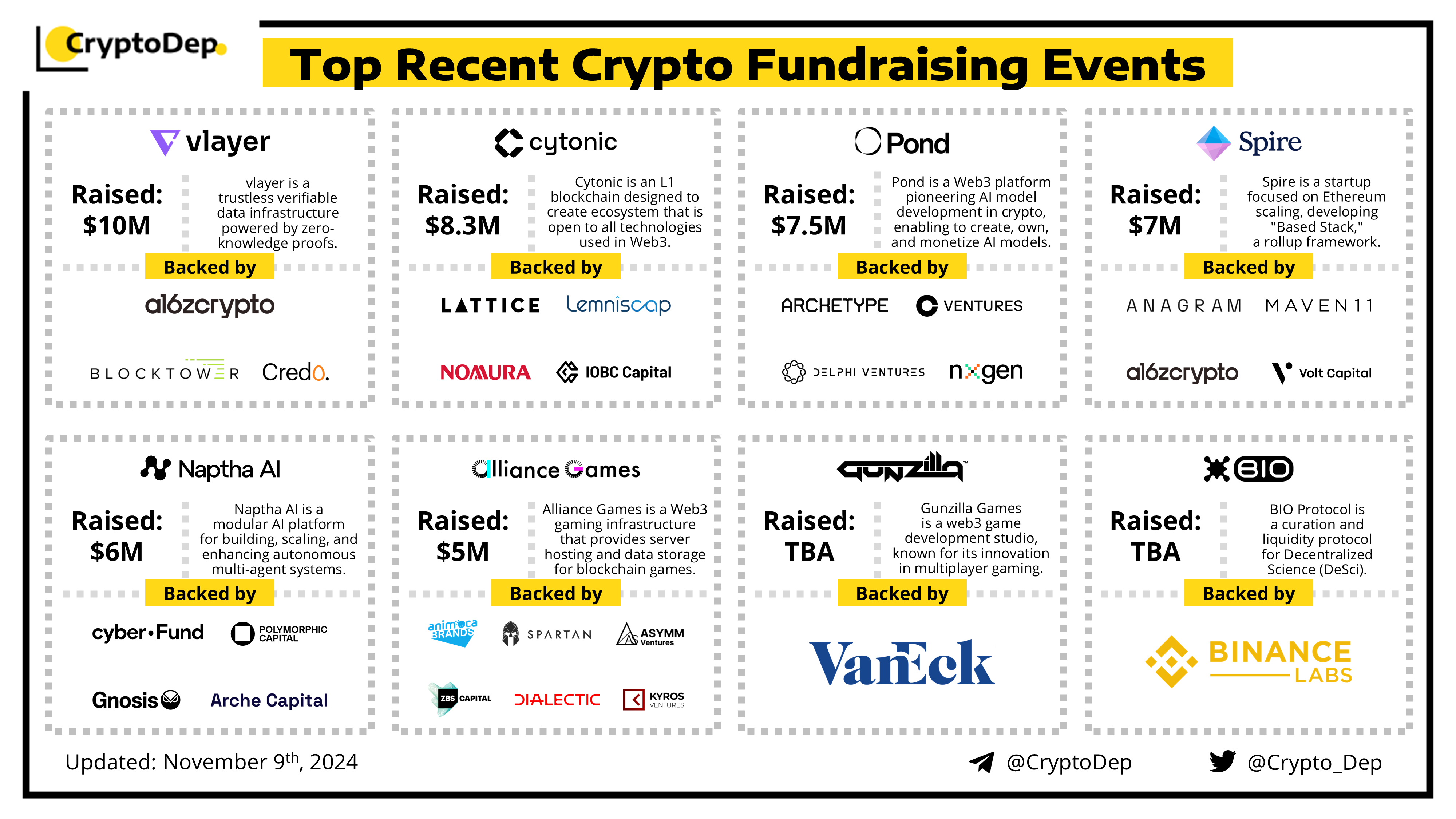 Presenting a list of some recent crypto fundraising events, backed by well-known investors such as a16z crypto (CSX), Binance Labs, Animoca Brands, VanEck, Delphi Ventures, Blocktower, Coinbase Ventures, Maven 11, Spartan, ZBS Capital, Gnosis, and others. Let's take a look!