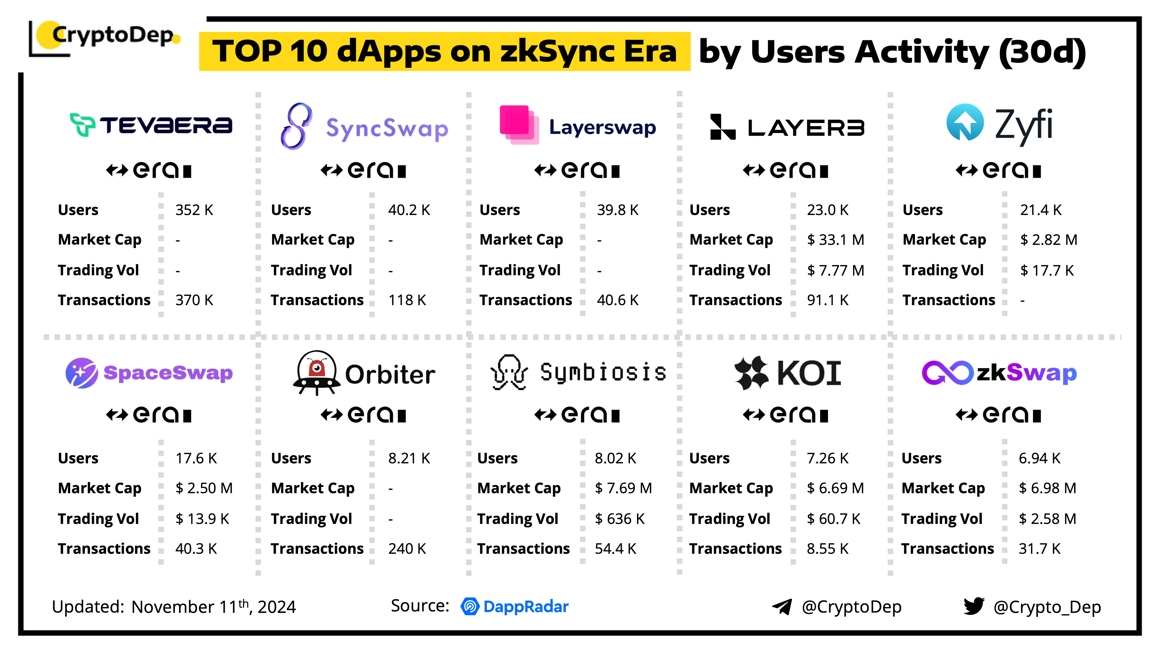 ββTop 10 dApps on zkSync Era by Users Activity (30d)