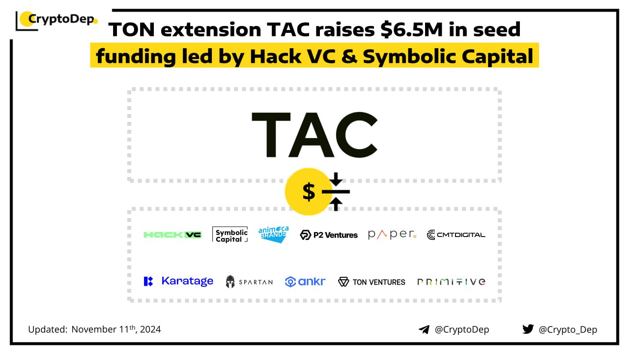 TAC, a TON network extension, has closed its $6.5M seed funding co-led by Hack VC and Symbolic Capital. Among additional investors are Primitive, Paper Ventures, Karatage, Animoca Ventures, Spartan Capital, TON Ventures, CMT Digital, Bitscale Capital and Ankr, among others. TACβs public testnet phase is expected to go live this week during Devcon, with a mainnet launch anticipated in the first quarter of 2025.