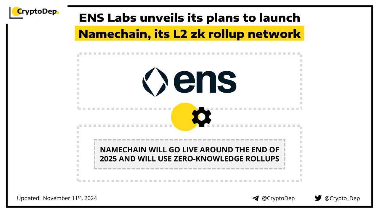ENS Labs, the company behind the Ethereum Name Service, has announced an upcoming launch of its layer-2 network. Called Namechain, the network will use zero-knowledge rollups and will be launched around the end of 2025. Earlier in October, Ethereum Domain Name Service integrated with Google.