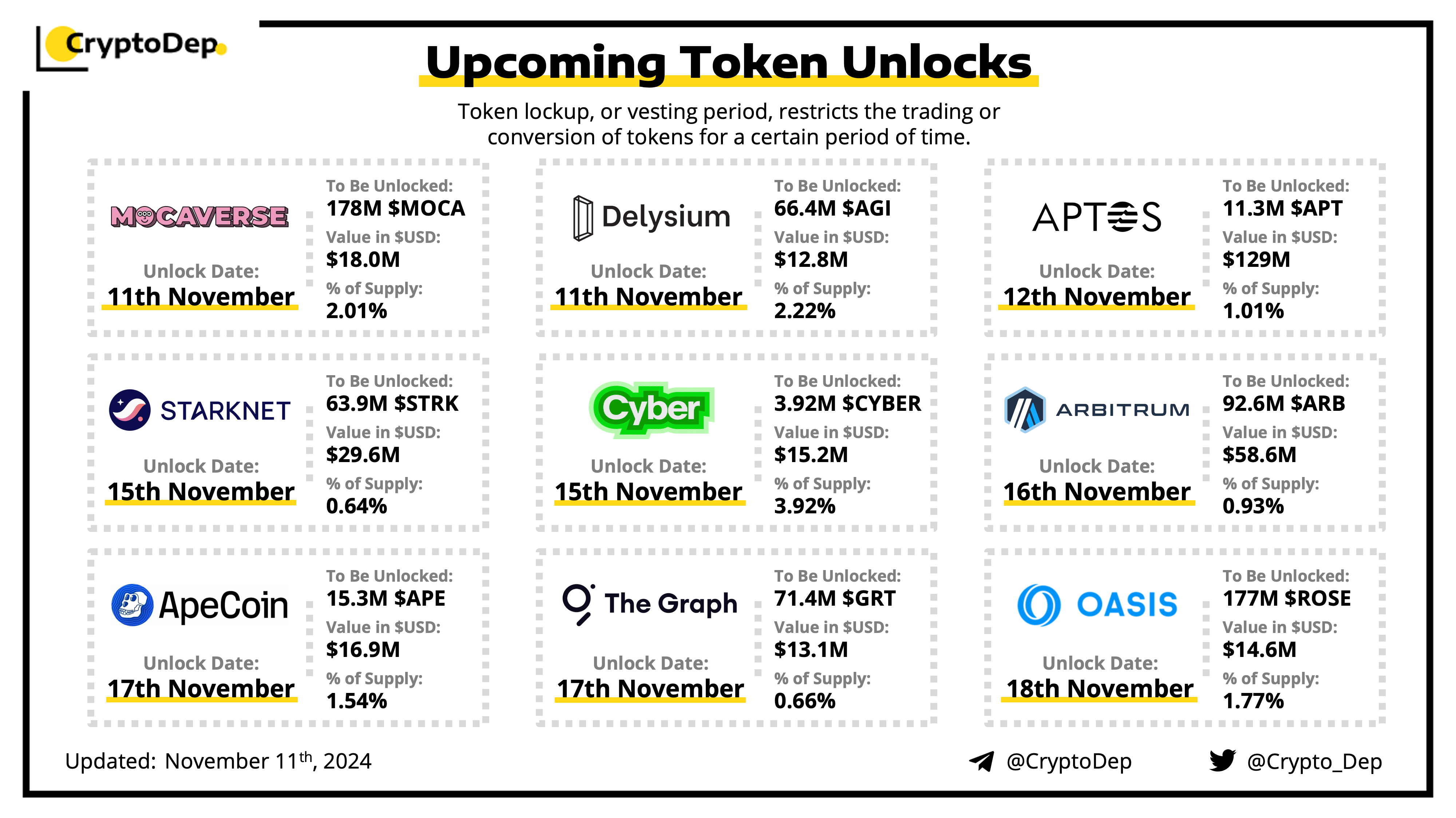 Let's take a look at the compilation of major upcoming token unlocks, diving into details such as dates, amounts, and projects related to tokens that are currently locked up, but will soon be released to the market. During this week, $APT, $ARB, $STRK, $MOCA, and $APE will have the biggest unlocks.